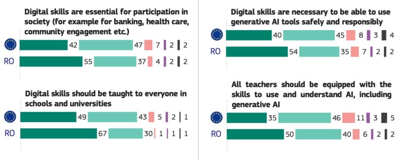 Respondenții din România sunt de acord în mai mare măsură decât media europeană la toate întrebările referitoare la sprijinul lor pentru formarea și educația digitală, mai puțin în ceea ce privește interdicția dispozitivelor digitale în școli.