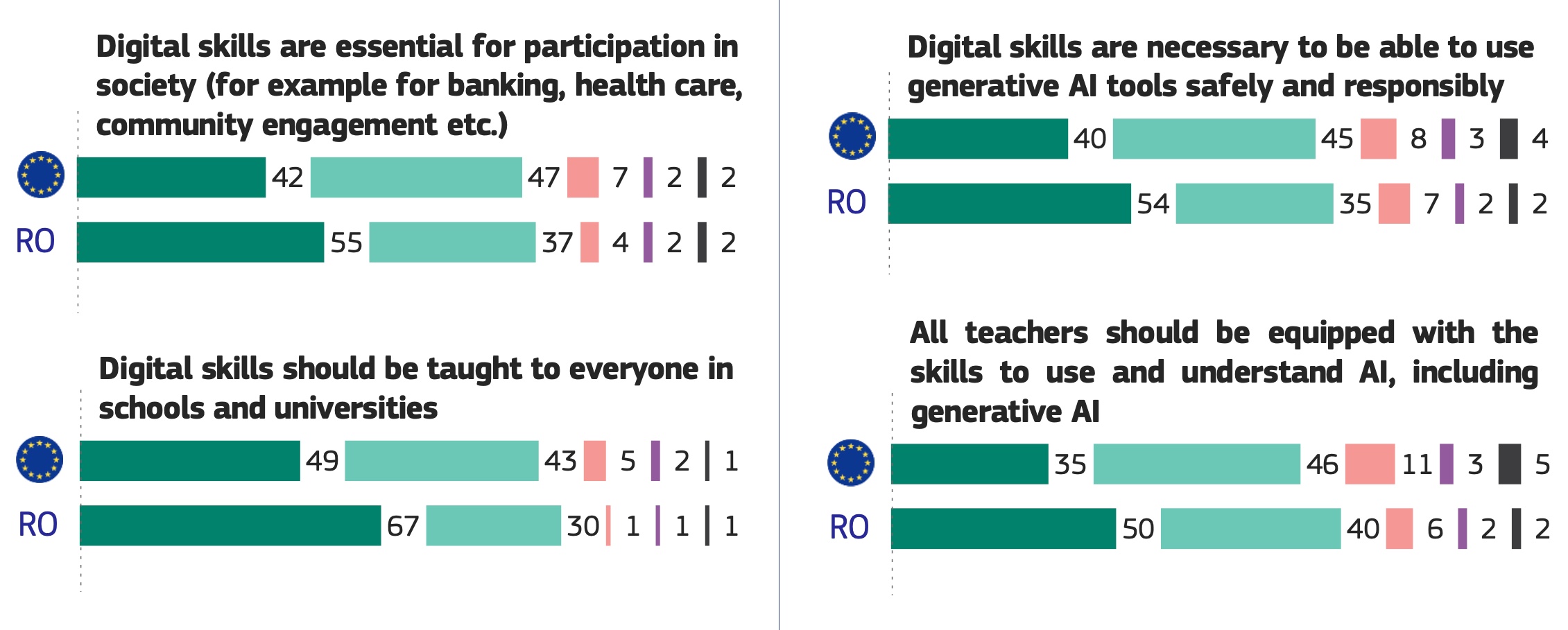 • Românii cred în mai mare măsură (89%) decât media europeană (85%) că pentru folosirea inteligenței artificiale generative în mod sigur și responsabil este nevoie de competențe digitale