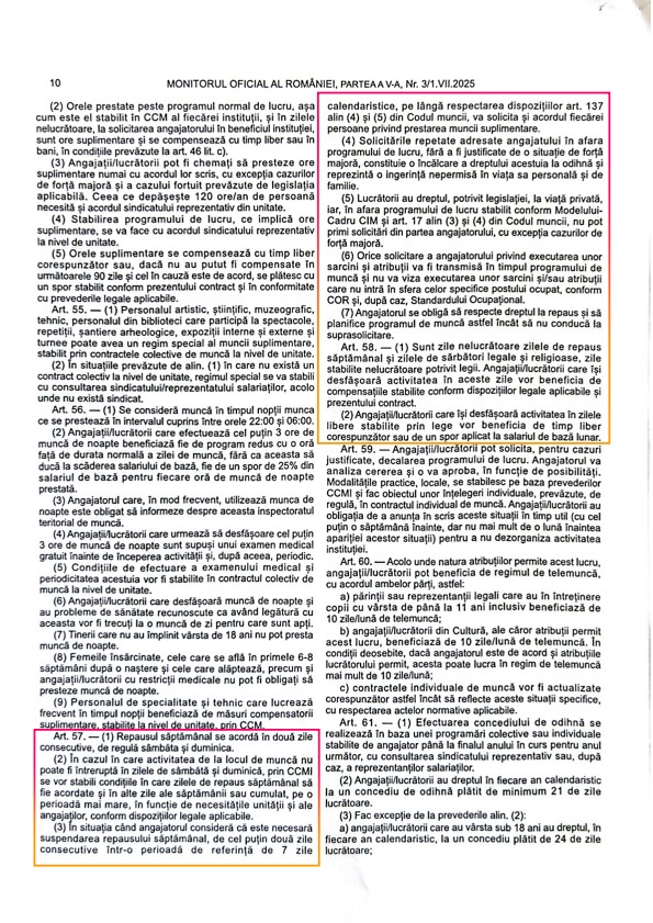 Noul CCM la nivel sectorial, înregistrat în mai 2025 și publicat în Monitorul Oficial la începutul acestei luni, prevede, la art. 57 (1)-(2)-(3), condițiile de repaos și de muncă în condițiile în care angajații primesc sporuri sau compensații, indicând rolul pe care instituția angajatoare îl are pentru a stabili aceste date: