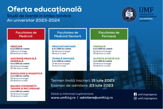 Universitatea de Medicină și Farmacie ”Iuliu Hațieganu” din Cluj-Napoca își deschide porțile către tinerii talentați și dornici să urmeze o carieră de succes în domeniul medical și farmaceutic. În data de 23 iulie, va avea loc examenul de admitere pentru cele opt programe de studii universitare de licență în limba română, din cadrul celor trei facultăți: Facultatea de Medicină, Facultatea de Medicină Dentară și Facultatea de Farmacie. Facilități oferite de UMF: burse și ajutoare financiare, prioritate la cazarea în căminele universității pentru studenții din anul I, o masă zilnică gratuită la restaurantele universității pentru studenții cu burse sociale și meniu subvenționat pentru toți studenții, consiliere psihologică, dezvoltare personală și orientare în carieră, servicii medicale gratuite și activități sportive, sală de fitness.