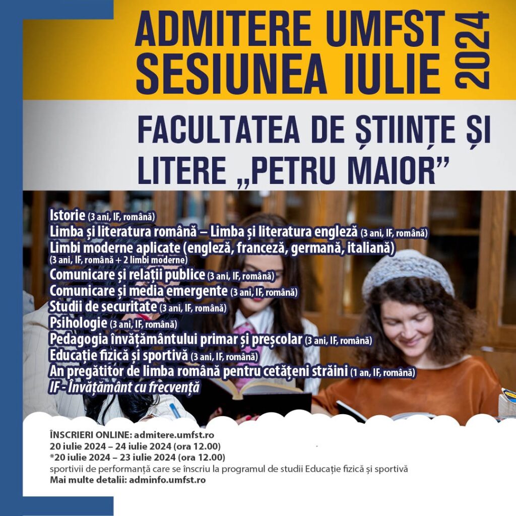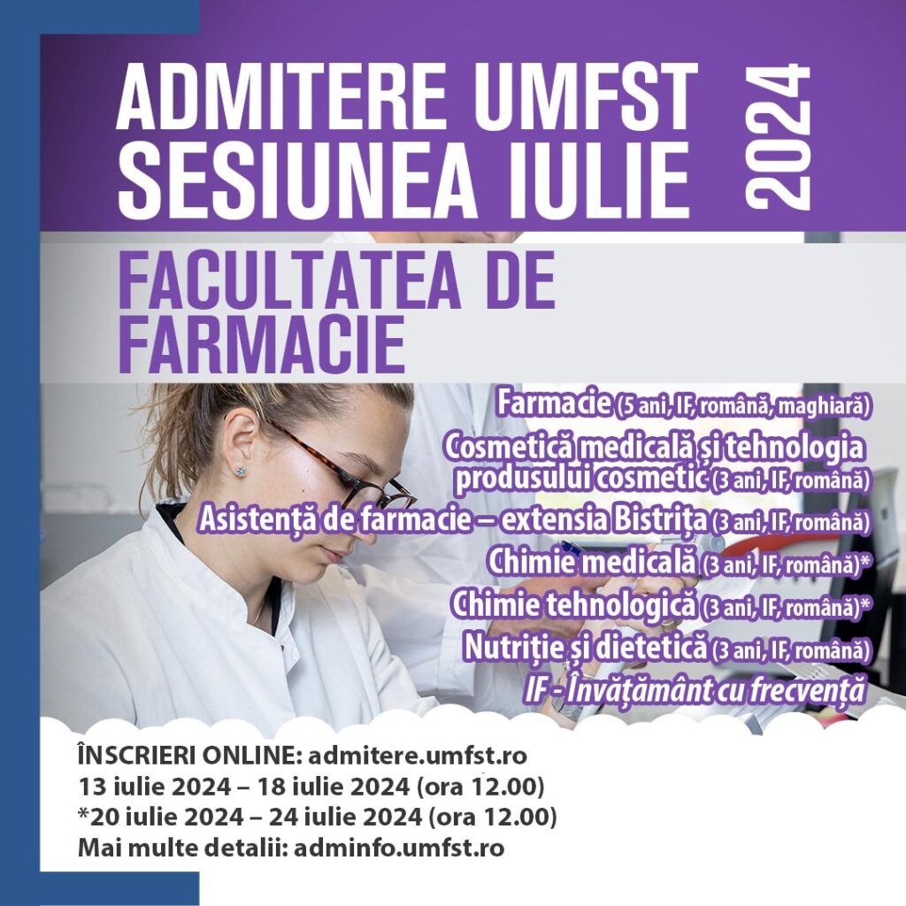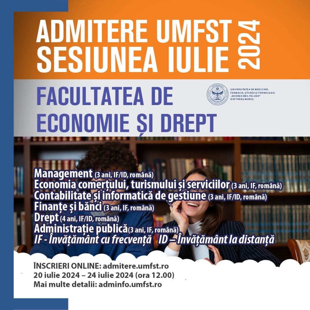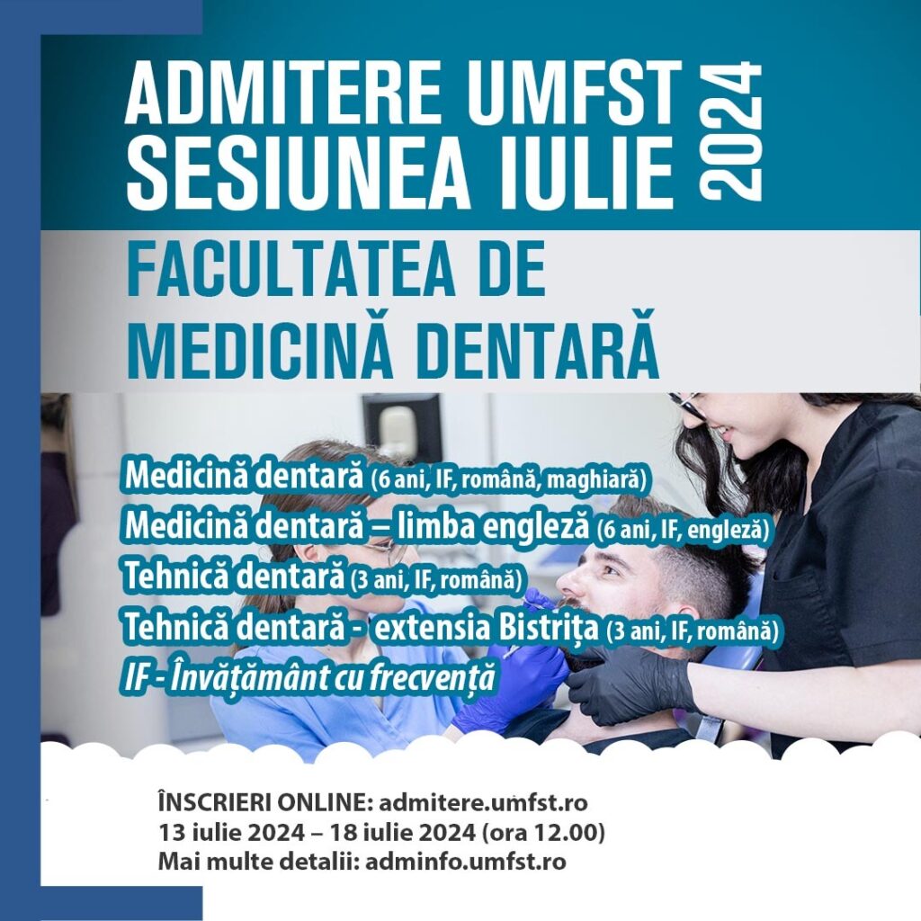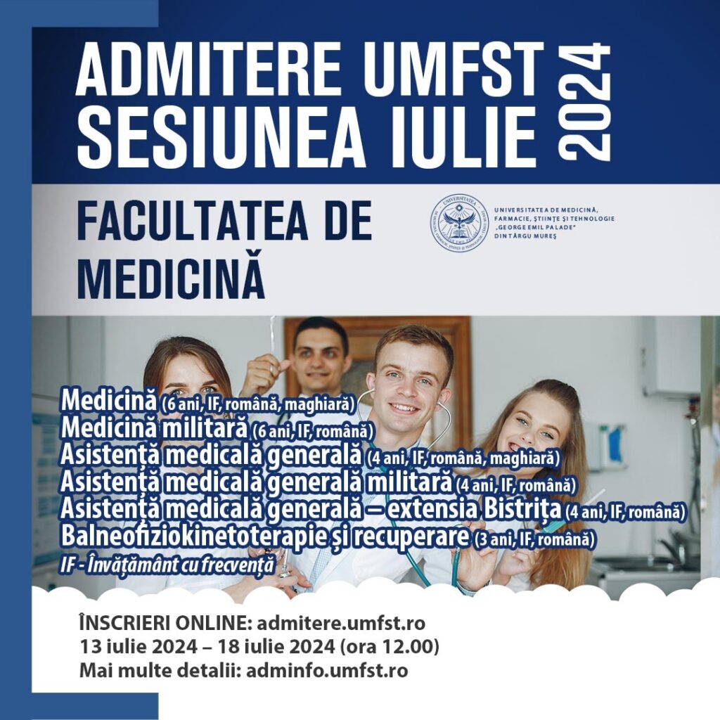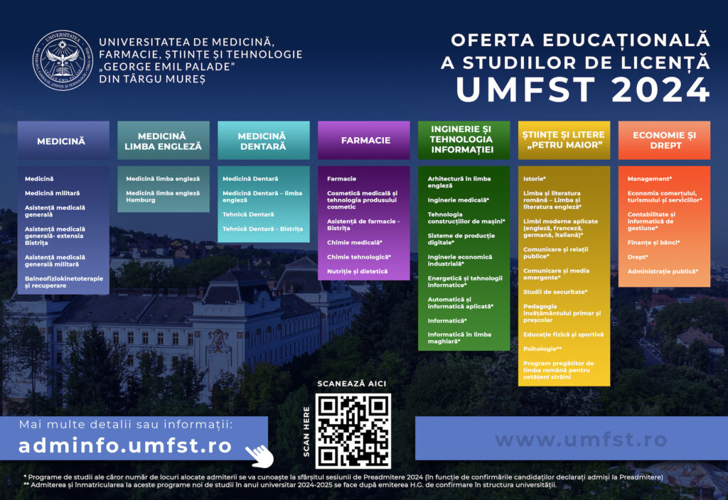 Pentru informații suplimentare privind Admiterea 2024 la Universitatea de Medicină, Farmacie, Științe și Tehnologie „George Emil Palade” din Târgu Mureș accesați https://adminfo.umfst.ro/, iar pentru înscriere accesați https://admitere.umfst.ro/.