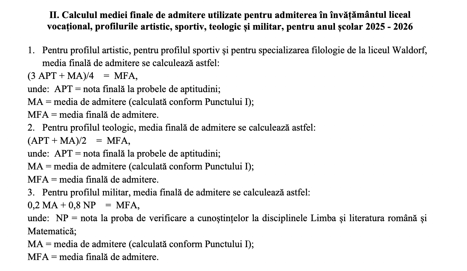 (2) La profilurile artistic, sportiv, teologic, militar și pentru specializarea filologie de la Liceul Waldorf, aprecierea probelor de aptitudini se face prin note. Calculul mediei finale de admitere pentru acești candidați se face în conformitate cu prevederile pct. II din anexa nr. 2.