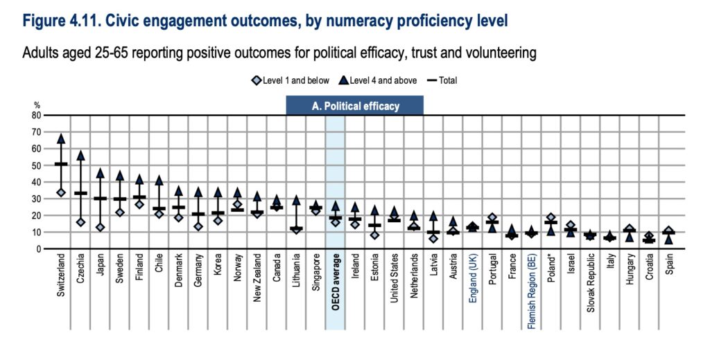 În ceea ce privește încrederea în capacitatea de a influența politica, studiul arată că situația nu este una uniformă, deși tendința generală este ca persoanele cu un nivel mai ridicat al competențelor să exprime și un nivel ridicat de încredere, iar adulții cu un nivel redus al competențelor prezintă și un grad scăzut al acestei încrederi. Sunt luate ca referință, în acest caz, competențele de alfabetizare numerică.