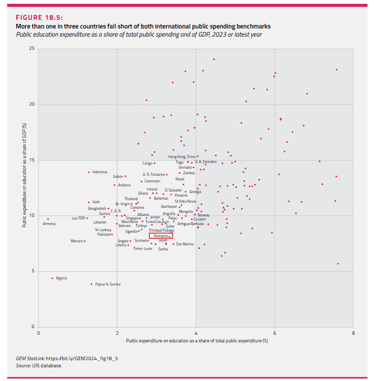 Guvernul român a cheltuit în anul 2023 doar 3.3% din PIB pentru educație. România este pe locul 123 în topul mondial, la același nivel cu Tanzania și după state precum Zambia, Anguilla, Palau, San Marino, Paraguay, Benin și Panama.