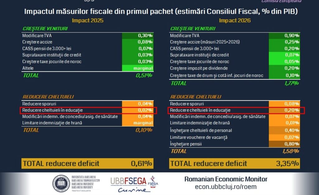 Impactul real al tăierilor din educație operate prin Legea Bolojan este marginal pentru bugetul României – doar 0,02% din PIB în 2025 și 0,20% în 2026, arată analiza Romanian Economic Monitor (RoEM), proiect al Facultății de Științe Economice și Gestiunea Afacerilor (FSEGA) din cadrul Universității Babeș-Bolyai (UBB). Analiștii RoEM se bazează pe estimările Consiliului Fiscal, care a calculat anterior că măsurile aplicate în educație vor aduce o economie de aproximativ 0,02% din PIB, ceea ce reprezintă 378 de milioane de lei, adică 0,6% din bugetul Ministerului Educației alocat pentru acest an.
