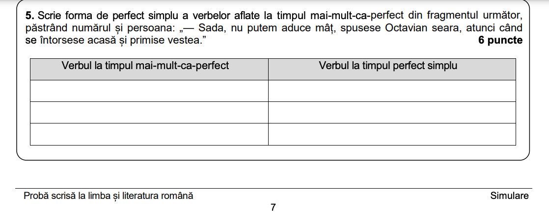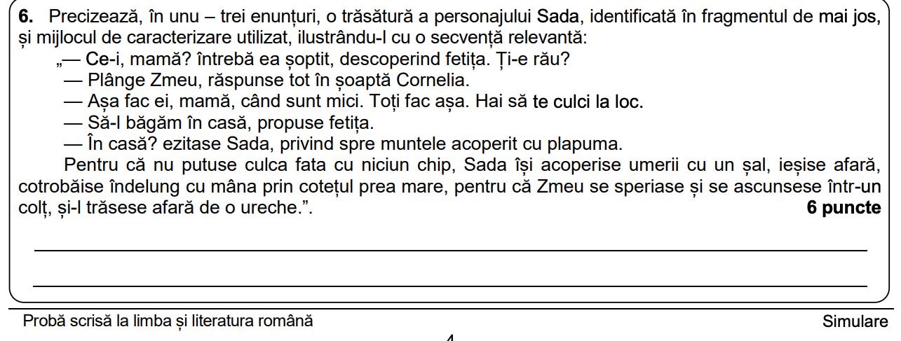 - Subiectul I, punctul 6 a fost de identificare a unei trăsături a unui personaj. În acest caz era vorba despre Sada, mama îngrijorată că nu putea să-și culce fata.