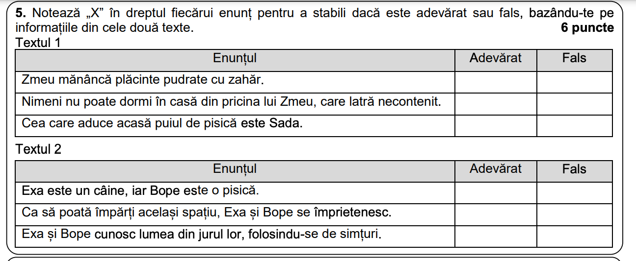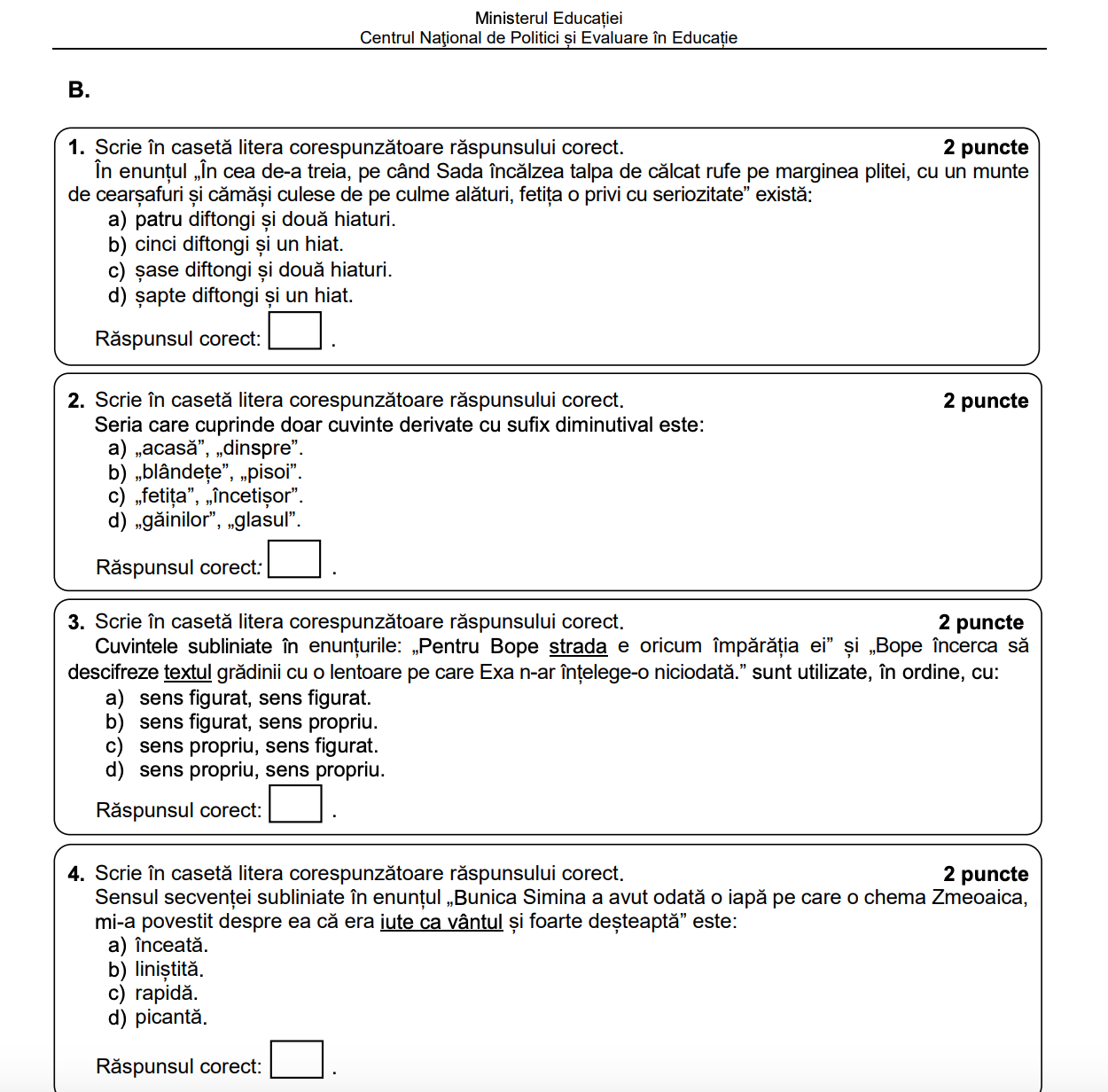 – corectitudinea gramaticală: 0 – 1 greșeli – 1 punct; 2 sau mai multe greșeli – 0 puncte;