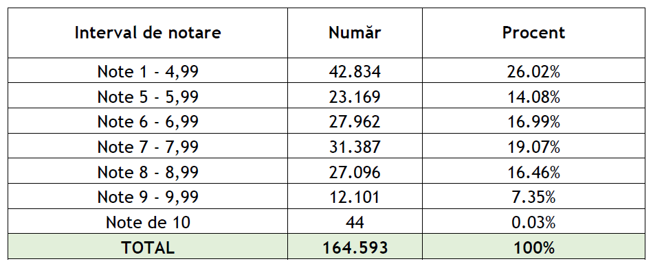 „Potrivit rapoartelor statistice furnizate de platforma informatică, se înregistrează următoarea situație pe probe și tranșe de note: