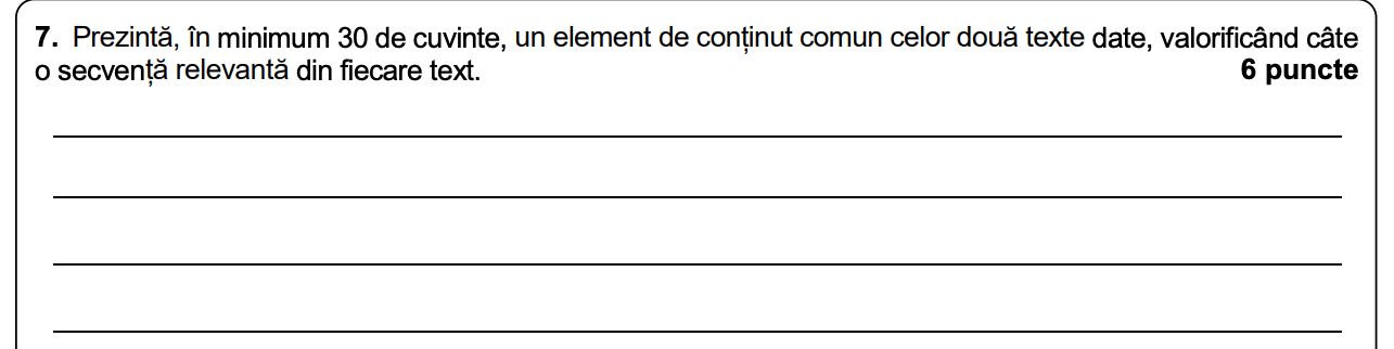 - Itemul 7 a cerut identificarea unui element de conținut comun al celor două texte date, cu valorificarea unei „secvențe relevante” din fiecare text. Enunțul scris de elev trebuia să aibă minimum 30 de cuvinte.