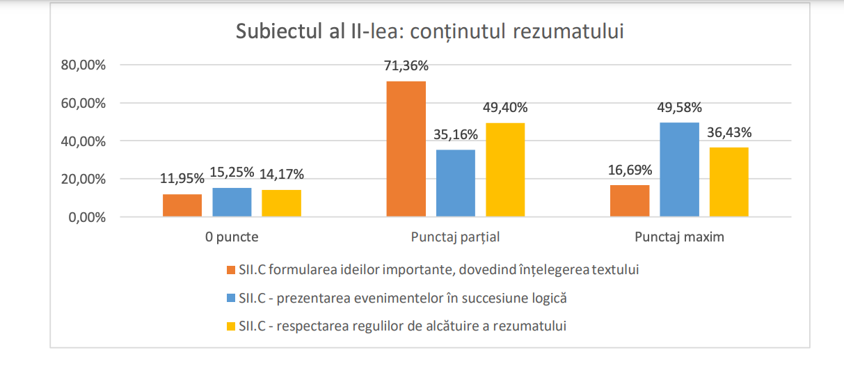 „La rezumat, dacă la conținut stăm destul de bine, cu anumite probleme la identificarea ideilor principale, la modul de concentrare, totuși, avem probleme la corectitudine gramaticală, a ortografiei, respectarea normelor de punctuație. Am observat asta, cel puțin la redactarea rezumatului, 57% dintre elevi au primit zero puncte la corectitudine gramaticală, la ortografie 63% au primit zero puncte, la respectarea normelor de punctuație 72%. Ideea este că această abilitate de bază a redactării ar trebui poate rafinată în ultima perioadă înainte de examen, cu o mai mare atenție la corectitudine și la nuanțele pe care elevul le are în exprimare”, spune profesorul de limba română, Bogdan Rațiu în analiza sa.