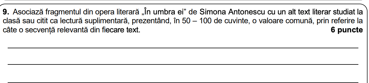 - Punctul 9 cerea o asociere pe care elevul să o facă între fragmentul din romanul „În umbra ei” de Simona Antonescu, primit la probă, și un alt text literar. Asocierea putea fi făcută cu un text studiat la clasă sau cu unul din lectura suplimentară a adolescenților. Argumentarea ar fi trebuit să fie făcută în 50-100 de cuvinte și în cadrul acesteia să valorifice „o valoare comună”.