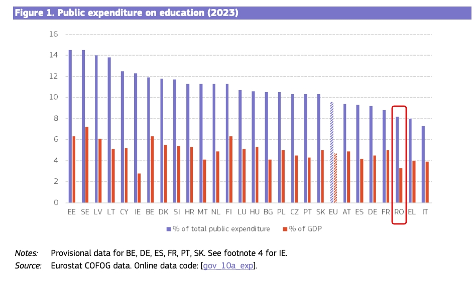 Cel mai recent raport relevant statistic pentru educația românească este cel referitor la „Investițiile în educație 2025”, publicat de Comisia Europeană la sfârșitul lunii august, arată că România este penultima printre statele membre UE în ceea ce privește procentul din PIB cheltuit pentru Educație (3,4% în 2023).