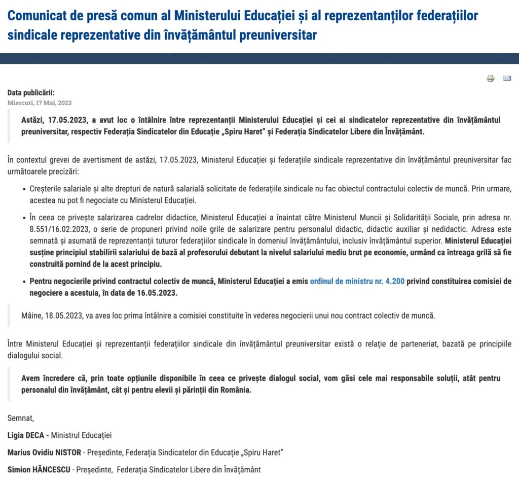 „Astăzi, 17.05.2023, a avut loc o întâlnire între reprezentanții Ministerului Educației și cei ai sindicatelor reprezentative din învățământul preuniversitar, respectiv Federația Sindicatelor din Educație „Spiru Haret” și Federația Sindicatelor Libere din Învățământ.