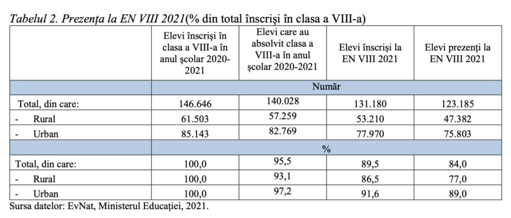 În același timp, în medie la nivel național, circa 1 din 6 elevi (16%) dintre cei care s-au înscris în clasa a VIII-a în 2020-2021 nu a participat la Evaluarea Națională, însă procentul este mult mai mare la sat: 23%, adică aproape un sfert din cohorta de rural (comparativ cu 11% în urban).