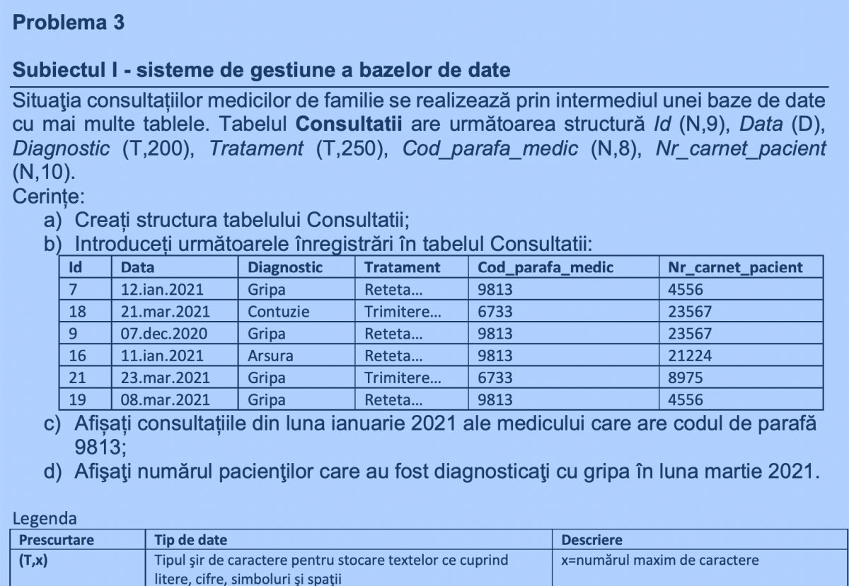 • (i) un subiect privind sistemele de gestiune a bazelor de date;