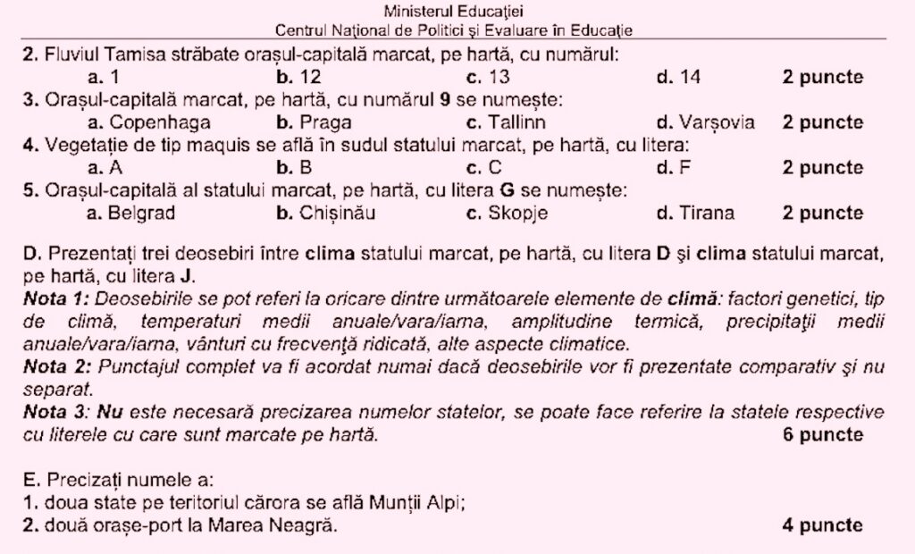Absolvenții care au ales Geografia au avut de rezolvat 3 subiecte. Cerințele de la primul subiect s-au bazat pe harta politică a Europei. La subiectul al II-lea, absolvenții de liceu au avut de rezolvat exerciții referitoare la harta României – unități de relief, râuri, ape.