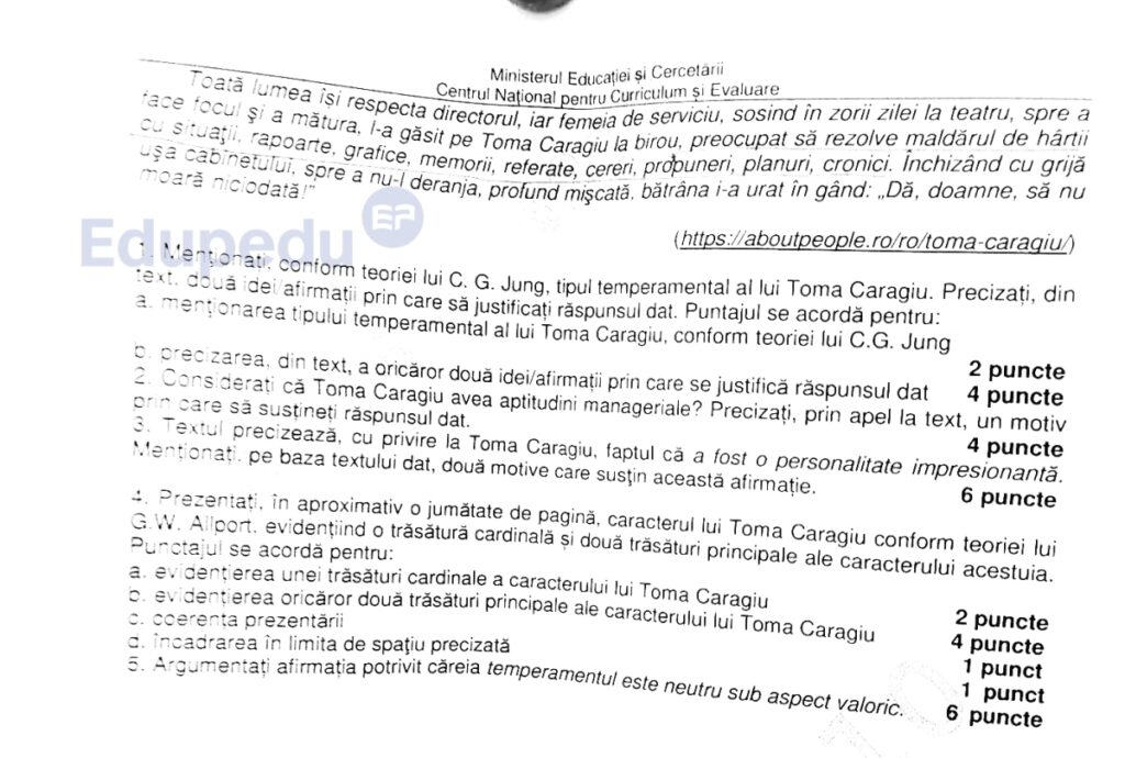 La subiectul al III-lea, candidații au avut de prezentat, în aproximativ o jumătate de pagină, caracterul lui Toma Caragiu conform teoriei lui G. W. Allport, pe baza unui text la prima vedere.