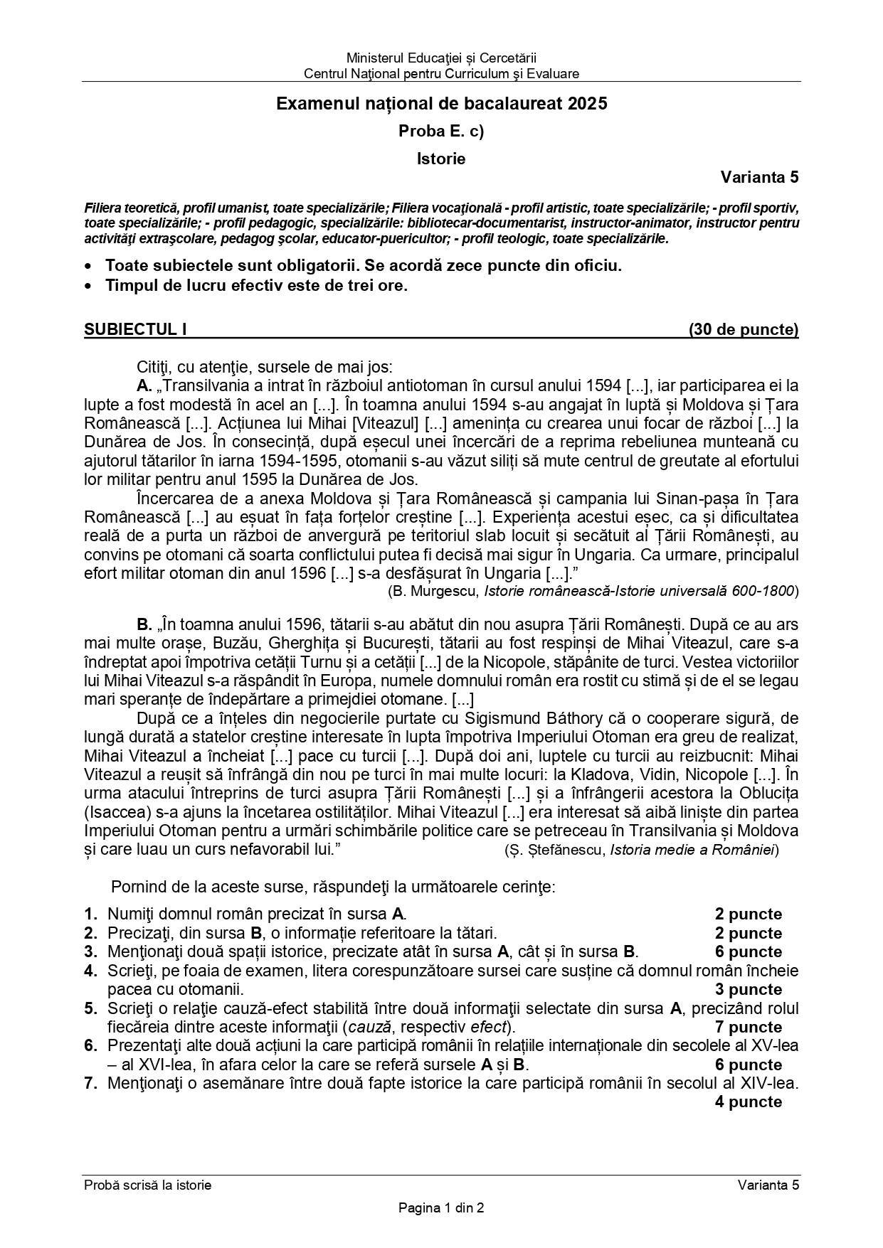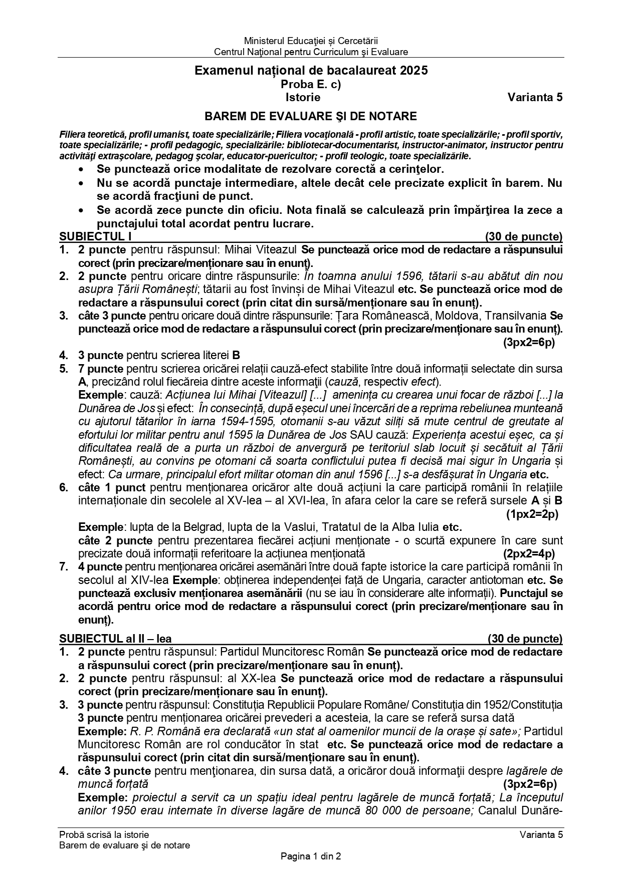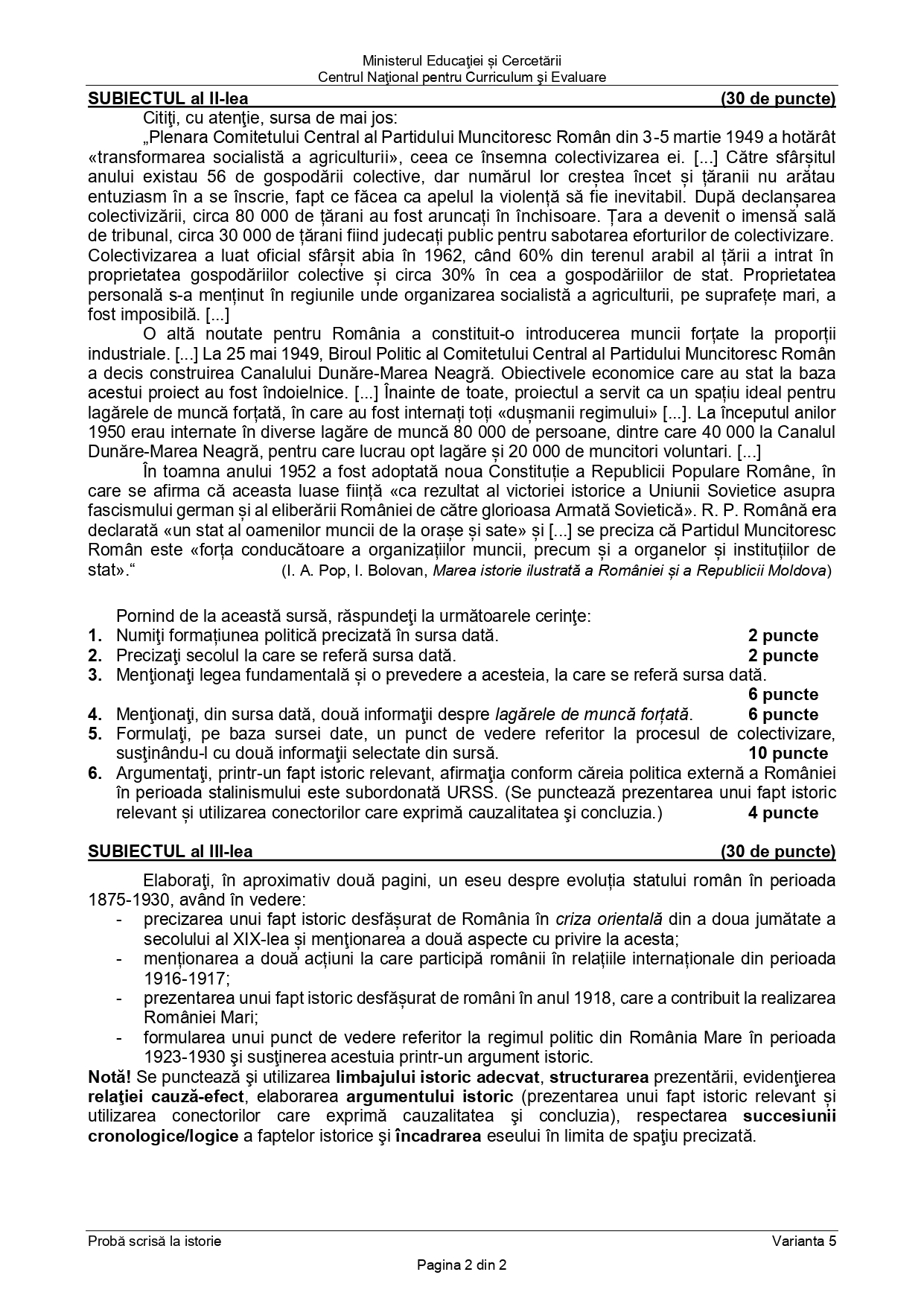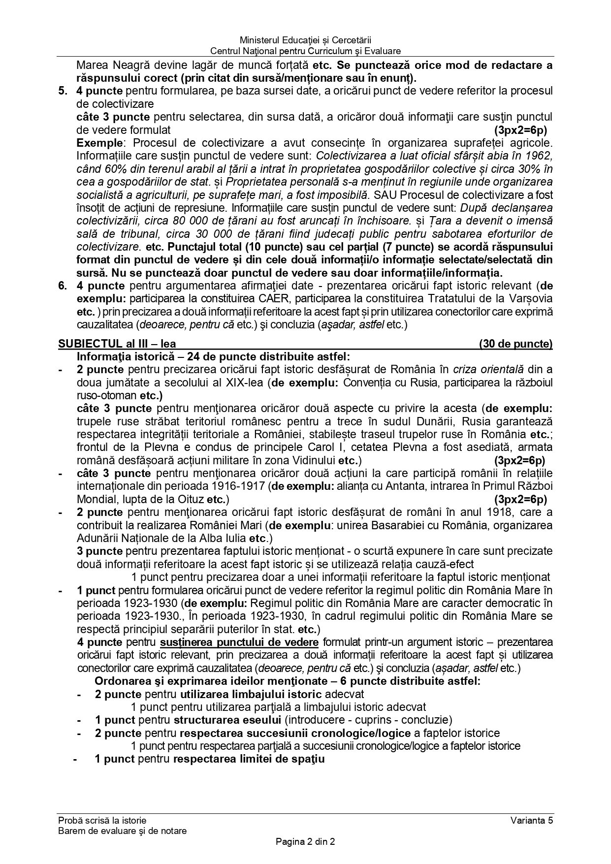 Baremul pentru varianta de rezervă la Istorie