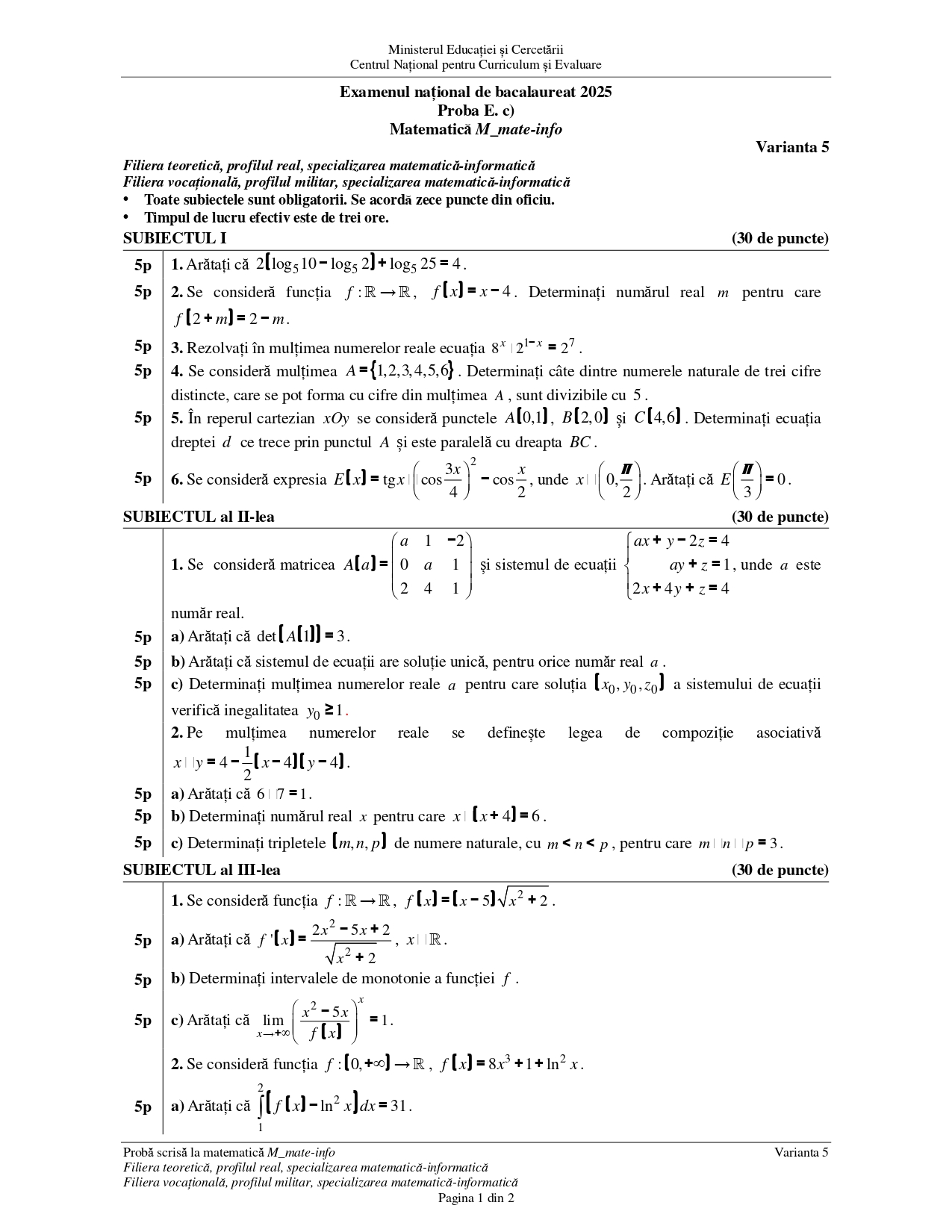 Ministerul Educației și Cercetării a publicat variantele de rezervă pentru Istorie și Matematică. Proba obligatorie a profilului din cadrul examenului național de BAC 2025 a fost susținută, miercuri, 11 iunie, de absolvenții de liceu. Cei de la filiera teoretică, profil real (specializările mate-info, științele naturii), filiera vocațională (militar) și cea tehnologică au dat examenul la Matematică.