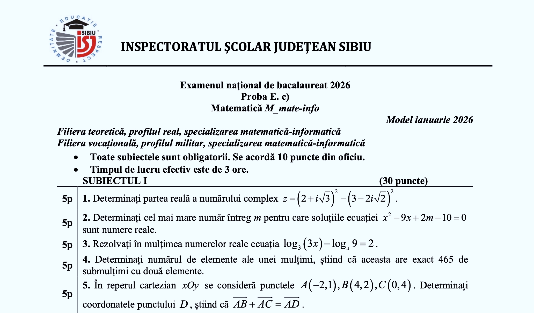 Inspectoratul Școlar Județean (ISJ) Sibiu a publicat teste de antrenament la Matematică pentru Bacalaureat 2026, pentru elevii de la Matematică Informatică, Științe ale naturii, Tehnologic și Pedagogic și bareme de evaluare și notare pentru luna ianuarie.