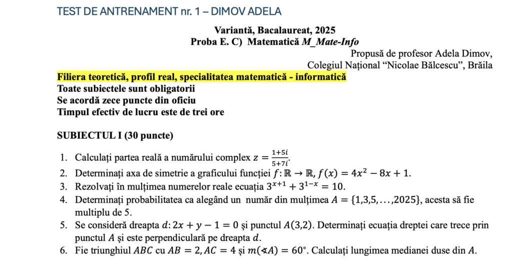 Test de antrenament la Matematică și barem pentru pregătirea examenului de Bacalaureat 2026, Mate-Info