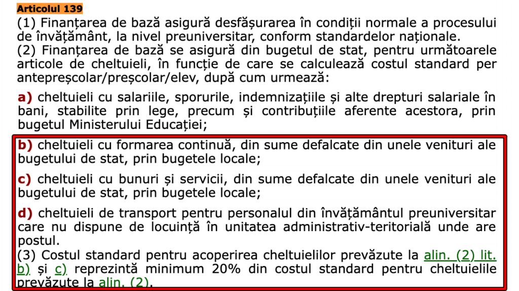 La art. 139, alin. (2) lit. d) este prevăzut că „finanțarea de bază se asigură din bugetul de stat, pentru următoarele articole de cheltuieli, în funcție de care se calculează costul standard per antepreșcolar/preșcolar/elev, după cum urmează: