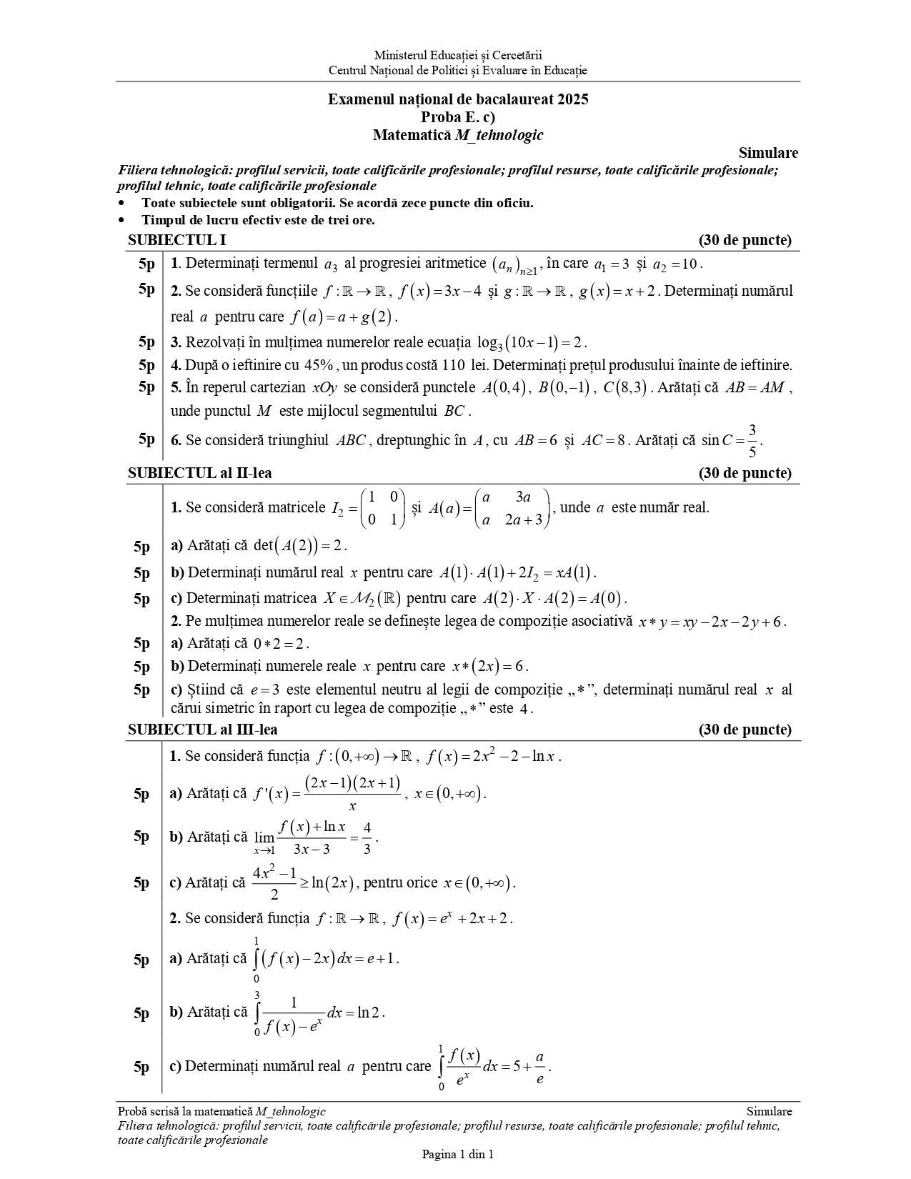 Subiectul pentru filiera tehnologică: