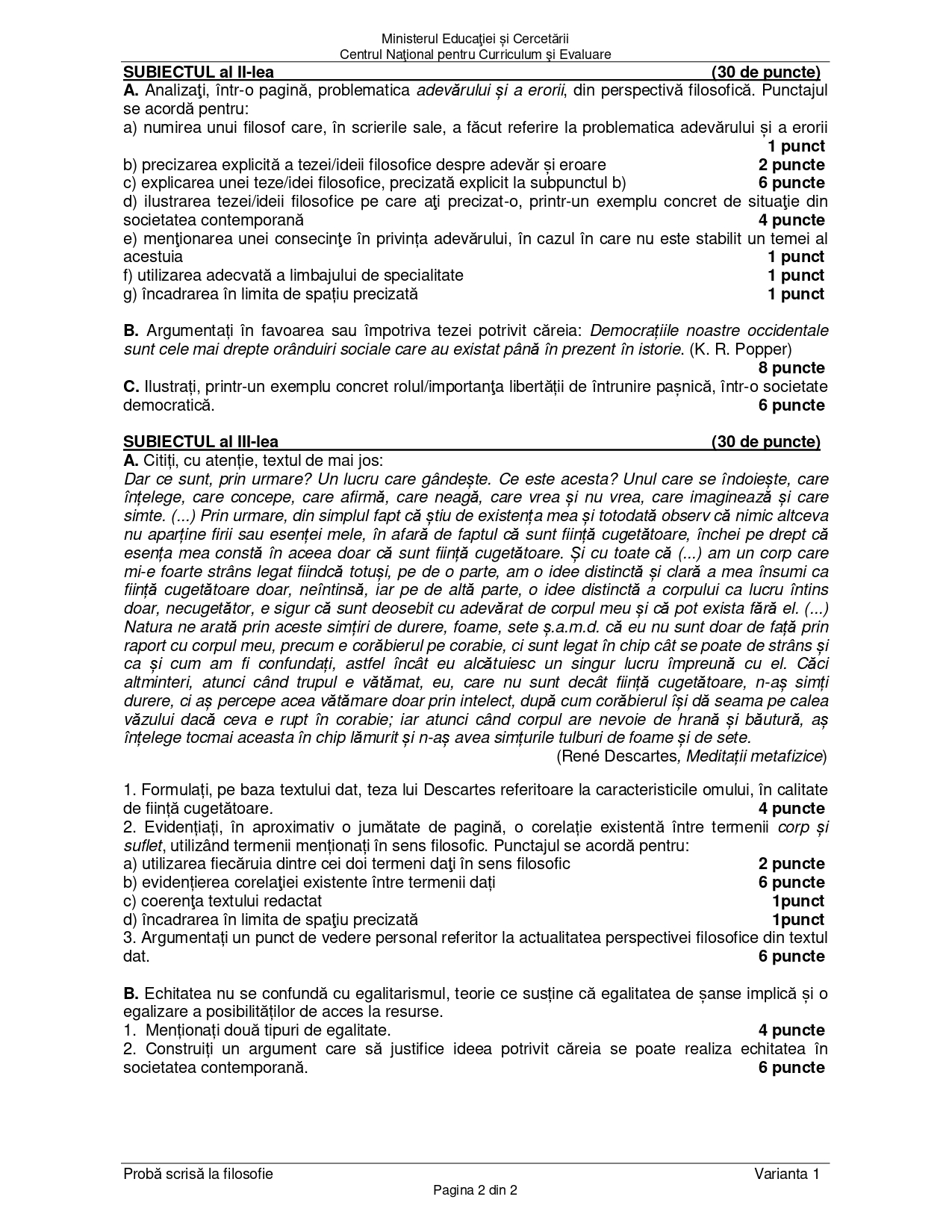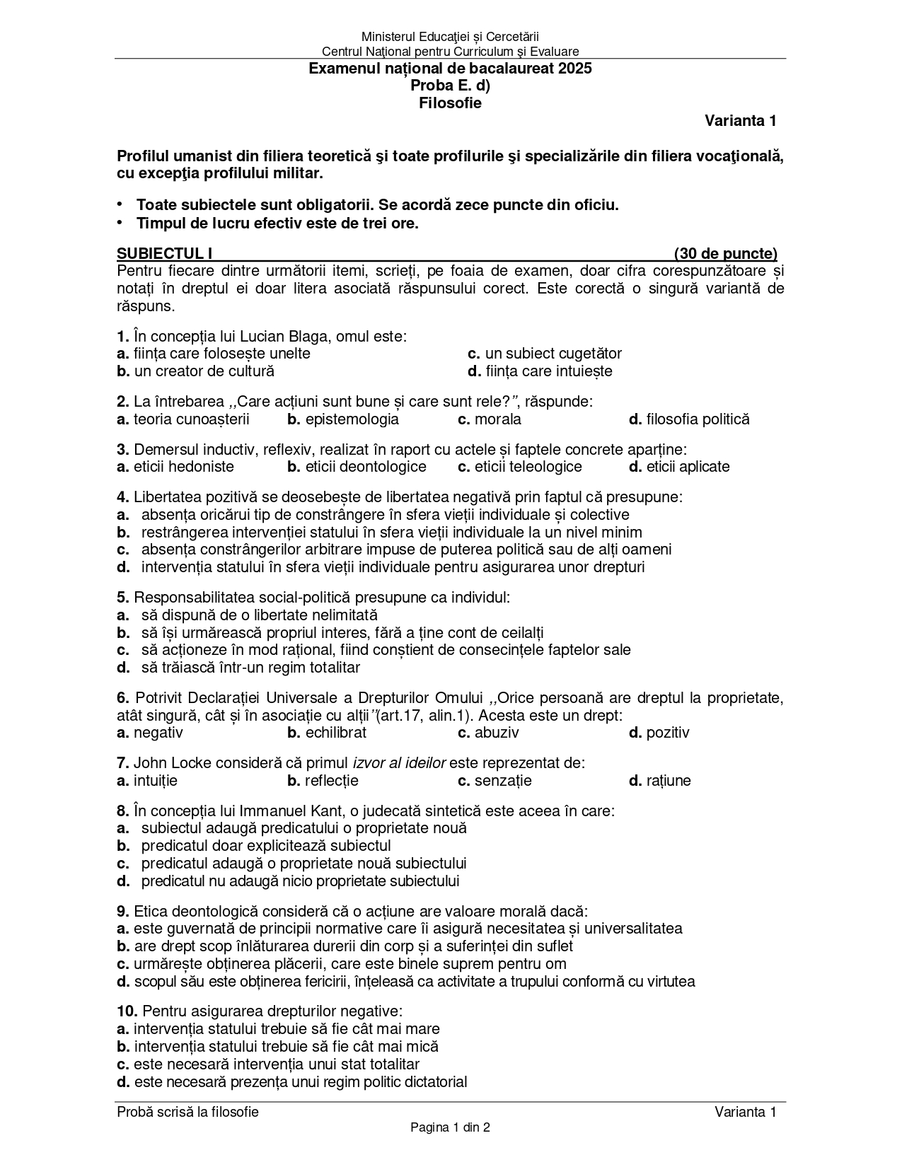 DOCUMENT DESCARCĂ Subiect Filosofie 2025: