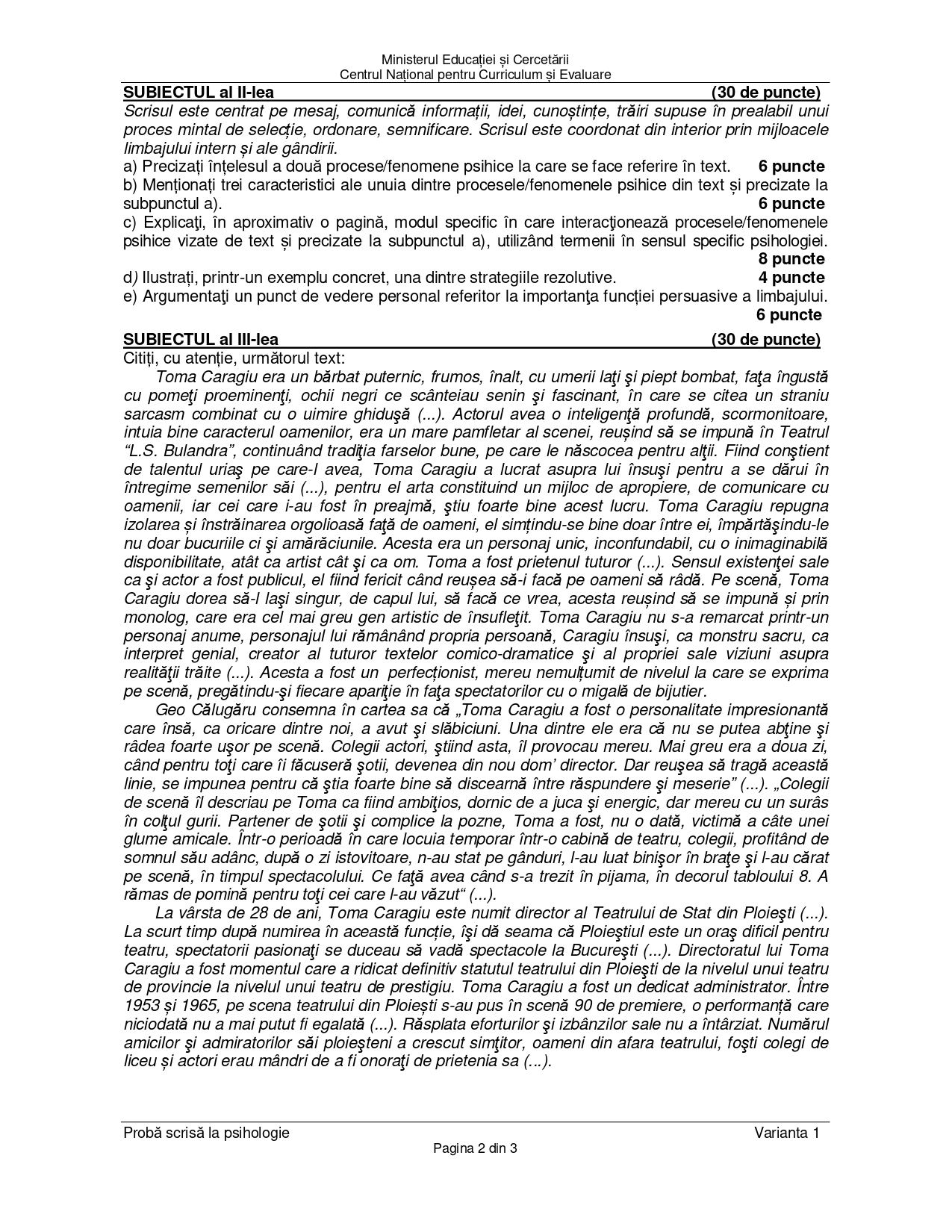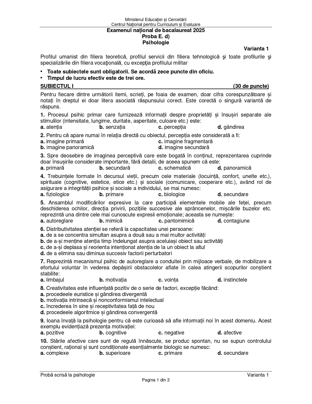 DOCUMENT DESCARCĂ Subiect Psihologie Bacalaureat 2025: