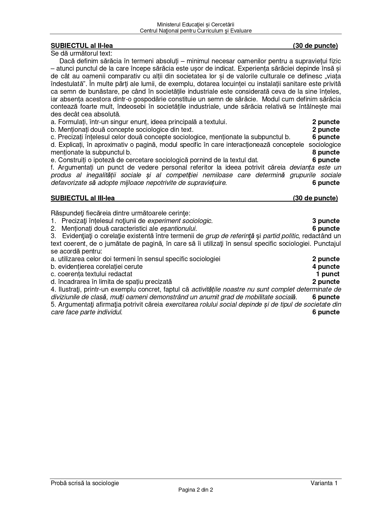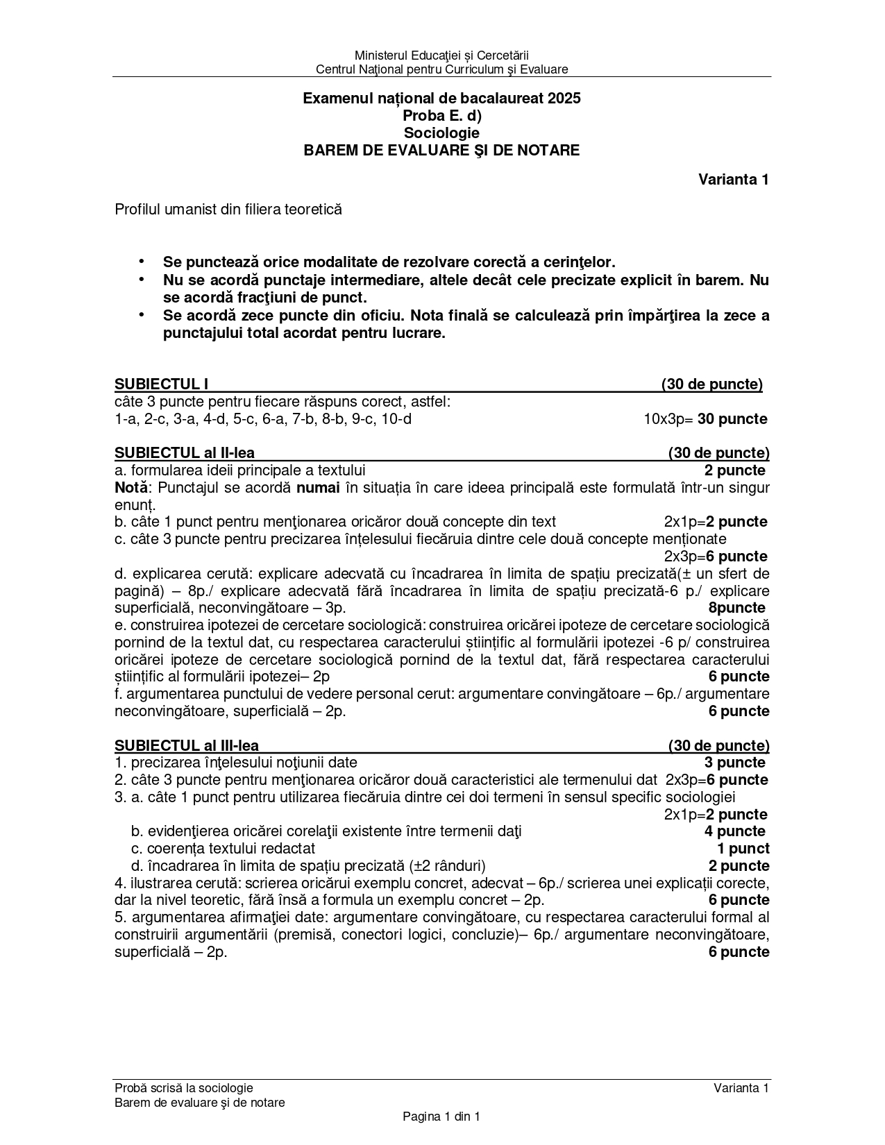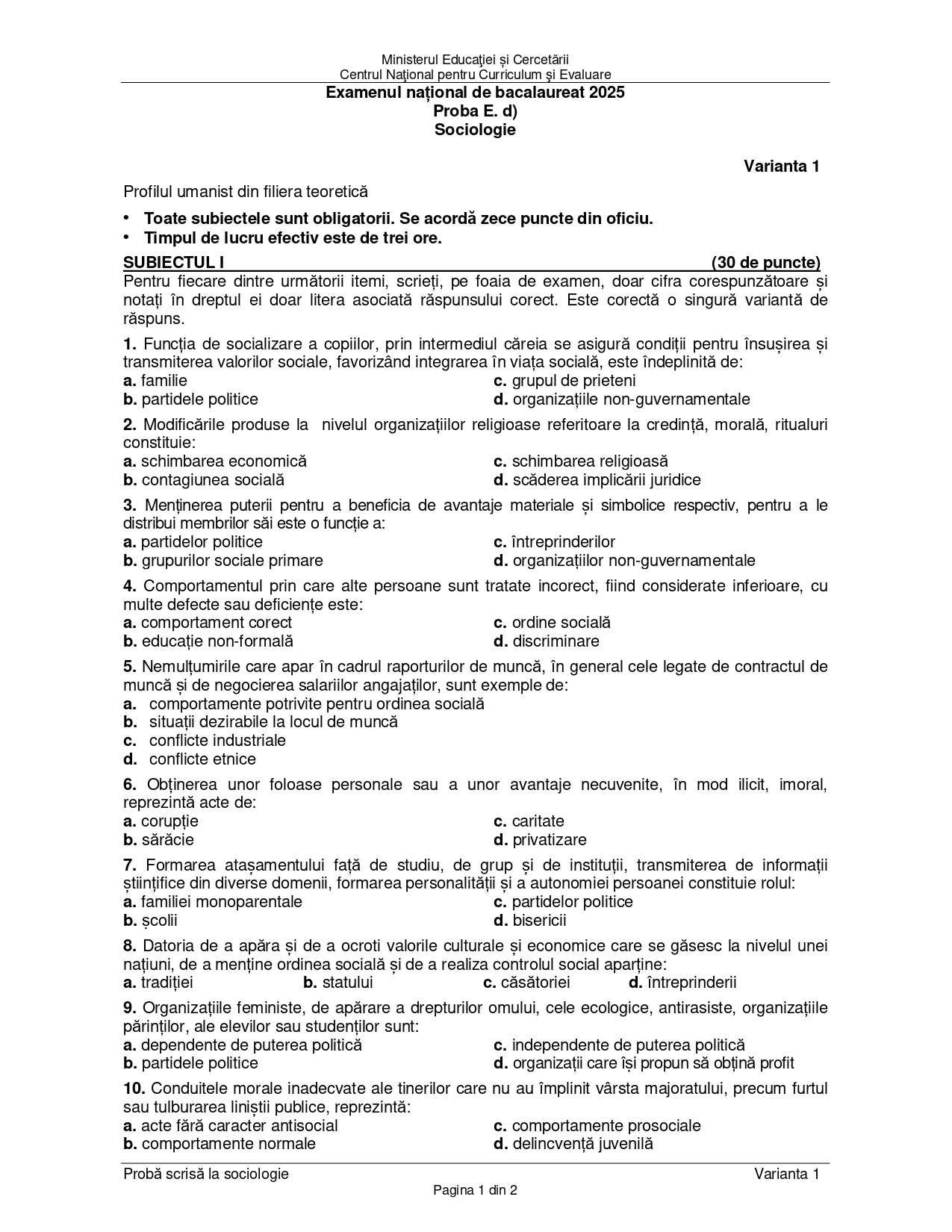 DOCUMENT DESCARCĂ Subiect Sociologie Bacalaureat 2025: