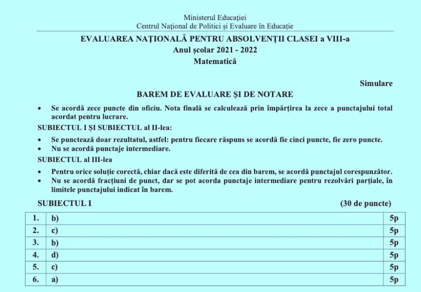 Baremele de corectare și notare pentru proba scrisă de Matematică, de la simularea Evaluării Naționale 2022, au fost publicate de ministerul Educației la ora 15:00.