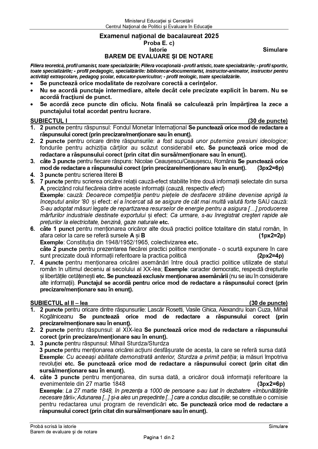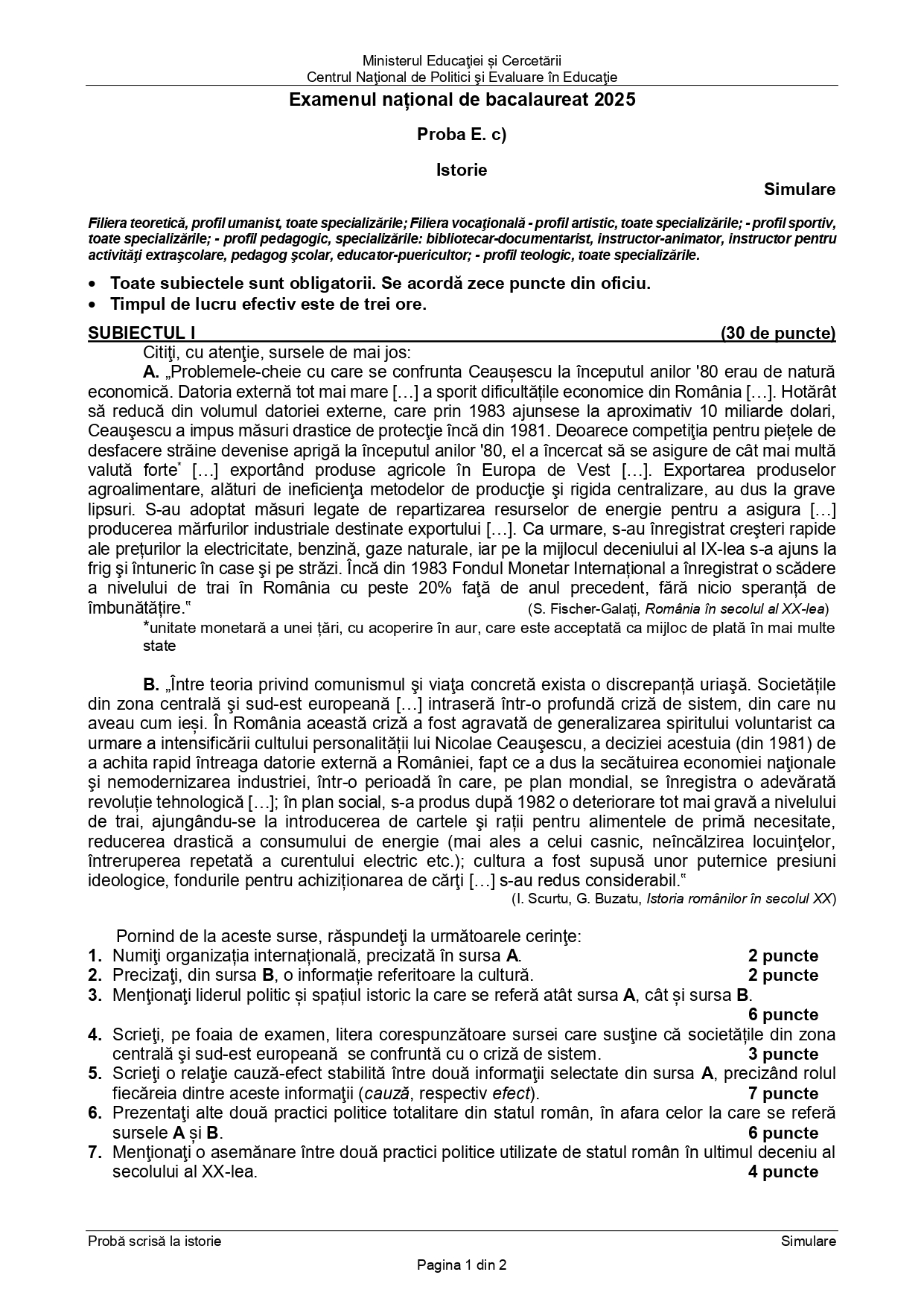 Subiectele și baremul de la simularea la Istorie susținută marți, 25 martie, de elevii de clasa a XII-a au fost publicate de Ministerul Educației. Simularea la Istorie a fost susținută de liceenii de la profilul umanist, precum și de la filiera vocațională, cu excepția celor de la specializarea învățători-educatoare.