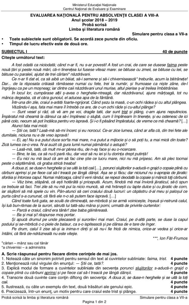 SUBIECTE simulare clasa a VII-a – Limba română: