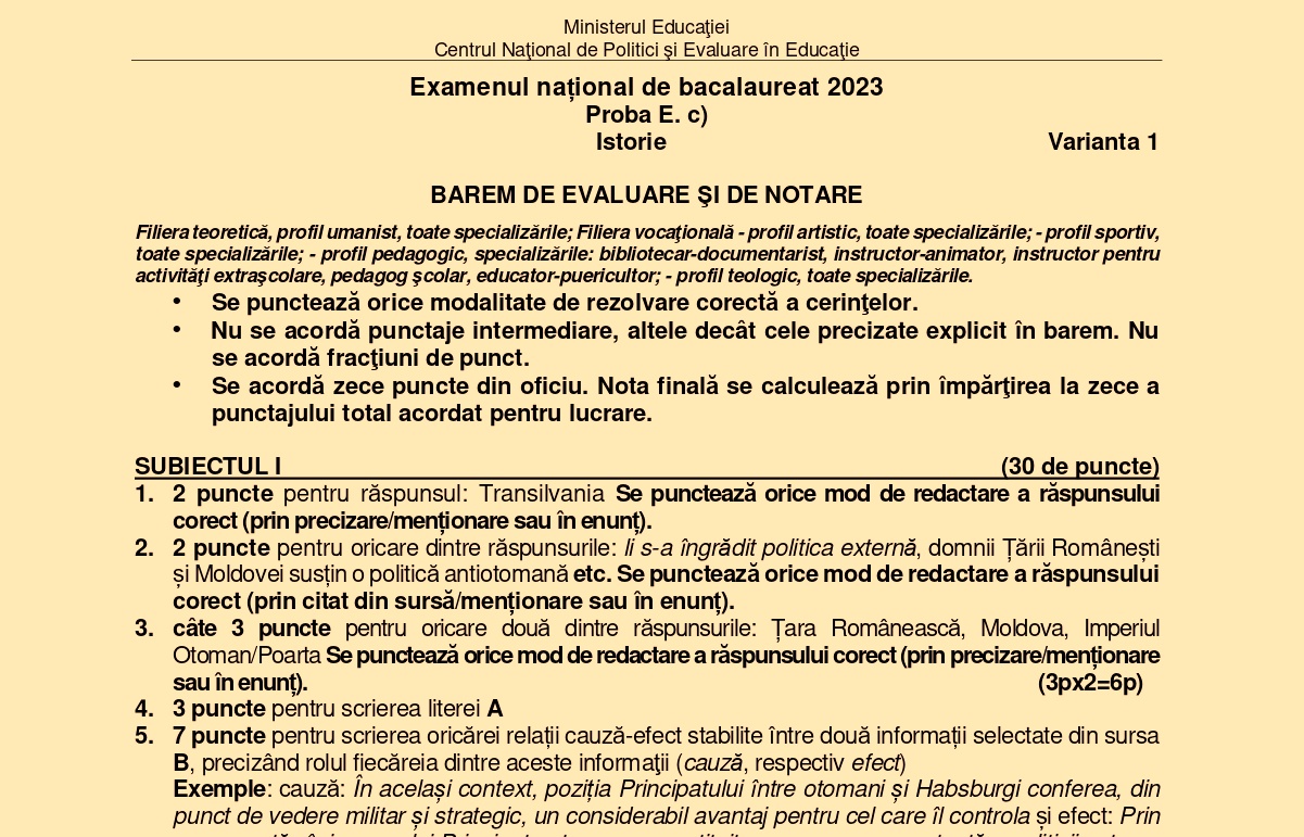 Baremul de corectare la Istorie de la Bacalaureat 2023: