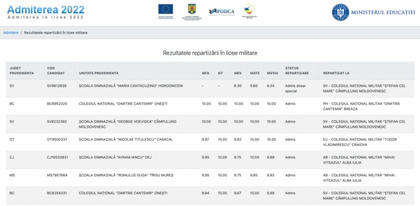 Ministerul Educației a publicat astăzi, 4 iulie 2022, rezultatele inițiale ale repartizării în liceele militare, pe admitere.edu.ro. Listele cu elevii admiși în liceele militare cuprind mediile de admitere și colegiile la care au fost repartizați.