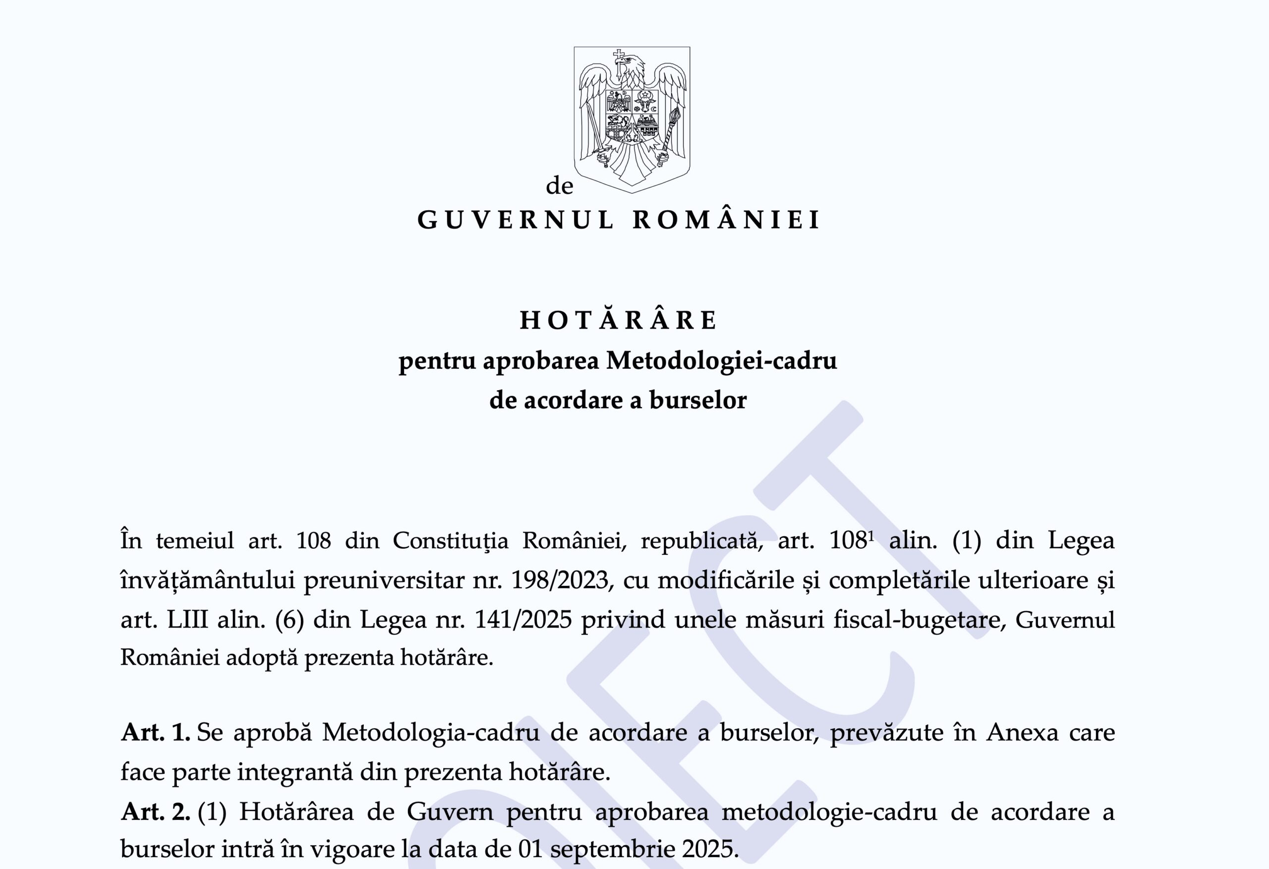 Metodologia-cadru de acordare a burselor în anul școlar 2025-2026 – proiect HG