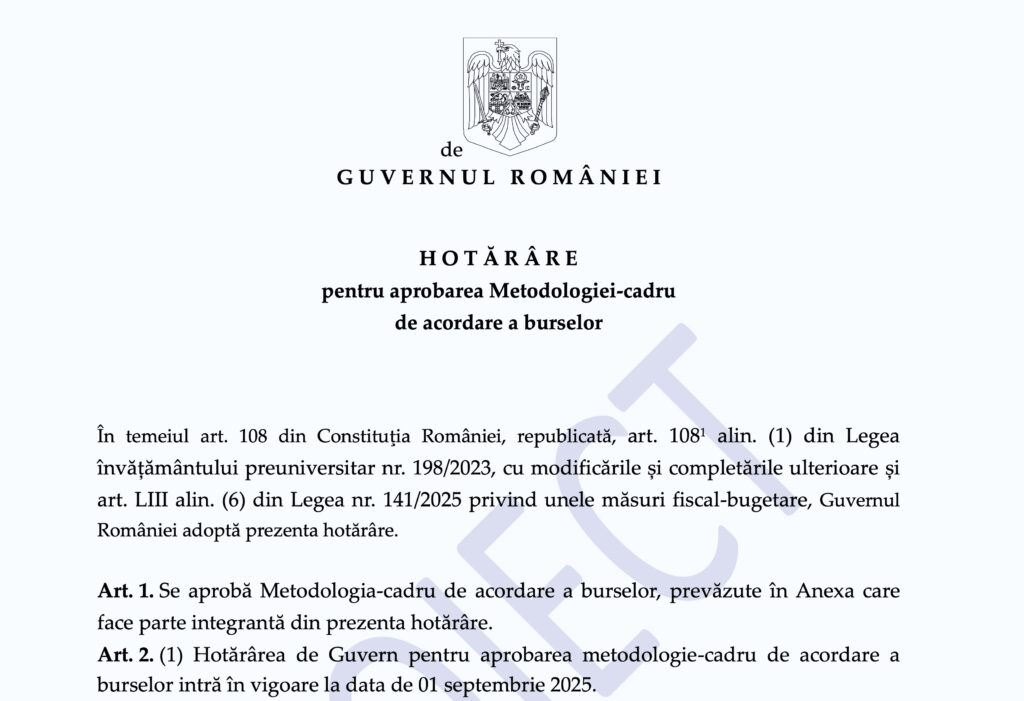 - Amintim că bursele pentru elevi au fost reconfigurate potrivit legii 141/2025 privind unele măsuri fiscal-bugetare (așa-numita Lege Bolojan). Actul normativ modifică Legea 198/2023 a învățământului preuniversitar, iar articolul vechi pentru burse este abrogat și rămân doar 3 tipuri de burse din 5, plus bursele pentru mame minore.