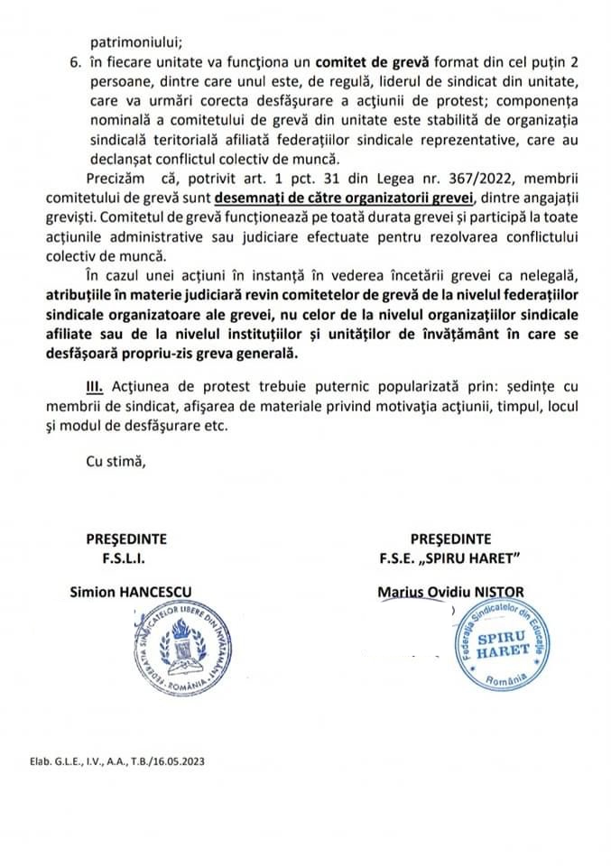 „1. În unitatea de învăţământ trebuie să fie prezenţi pe durata grevei toţi membrii de sindicat participanti la aceasta; în condică se va scrie „GREVĂ”; reamintim că, potrivit art. 234 alin. (1) din Legea nr. 53/2003 – Codul muncii, republicată, cu modificările si completările ulterioare, „greva reprezintă încetarea voluntară şi colectivă a lucrului de către salariaţi”, iar conform art. 153 alin. (5) din Legea nr. 367/2022, greviştii sunt prezenți în incinta unitatii;
