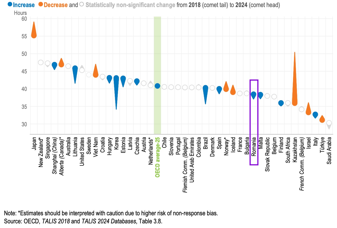 Potrivit fișei de țară pentru România, ce însoțește raportul TALIS 2024, participanții la cercetare, profesori de gimnaziu angajați cu normă întreagă, declarau în medie 38,5 ore pe săptămână – sub valoarea oficială de 40 de ore pe săptămână și sub media OCDE declarată de profesori, de 41 de ore.