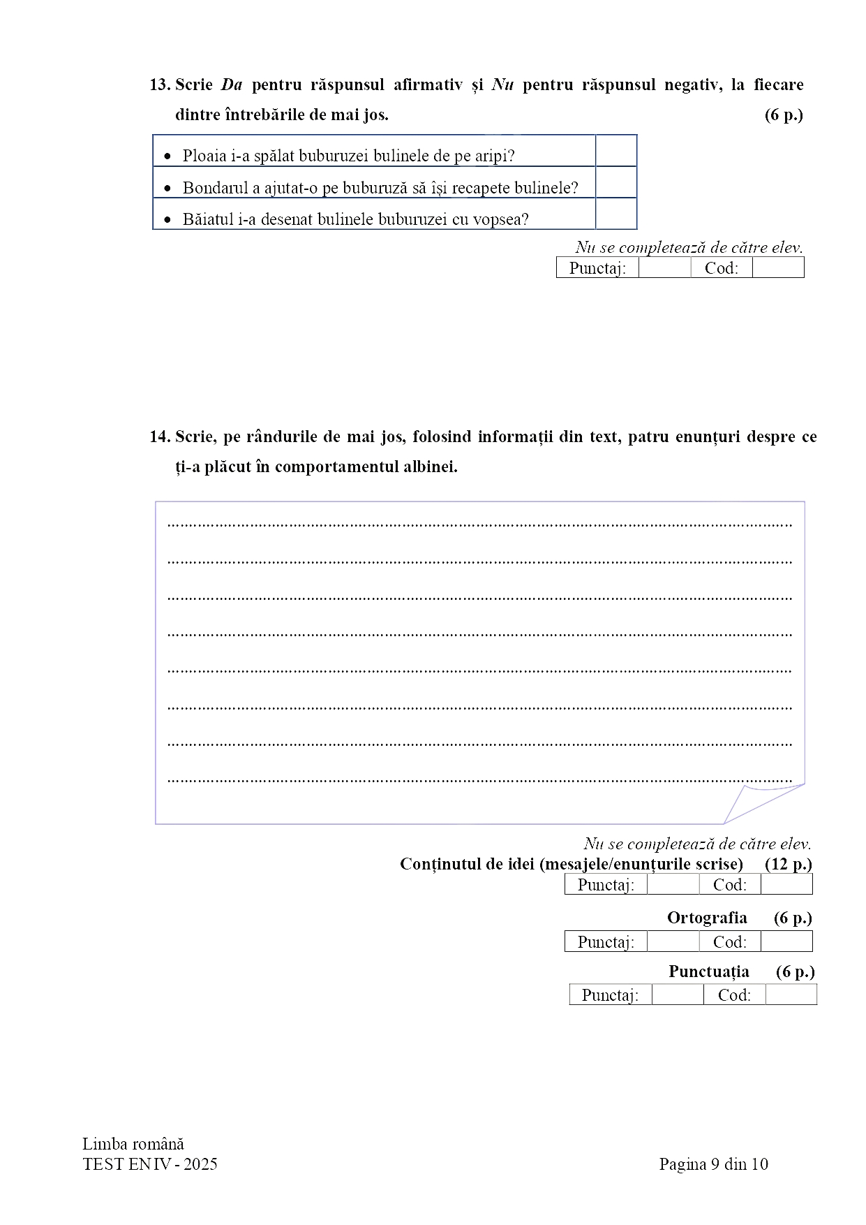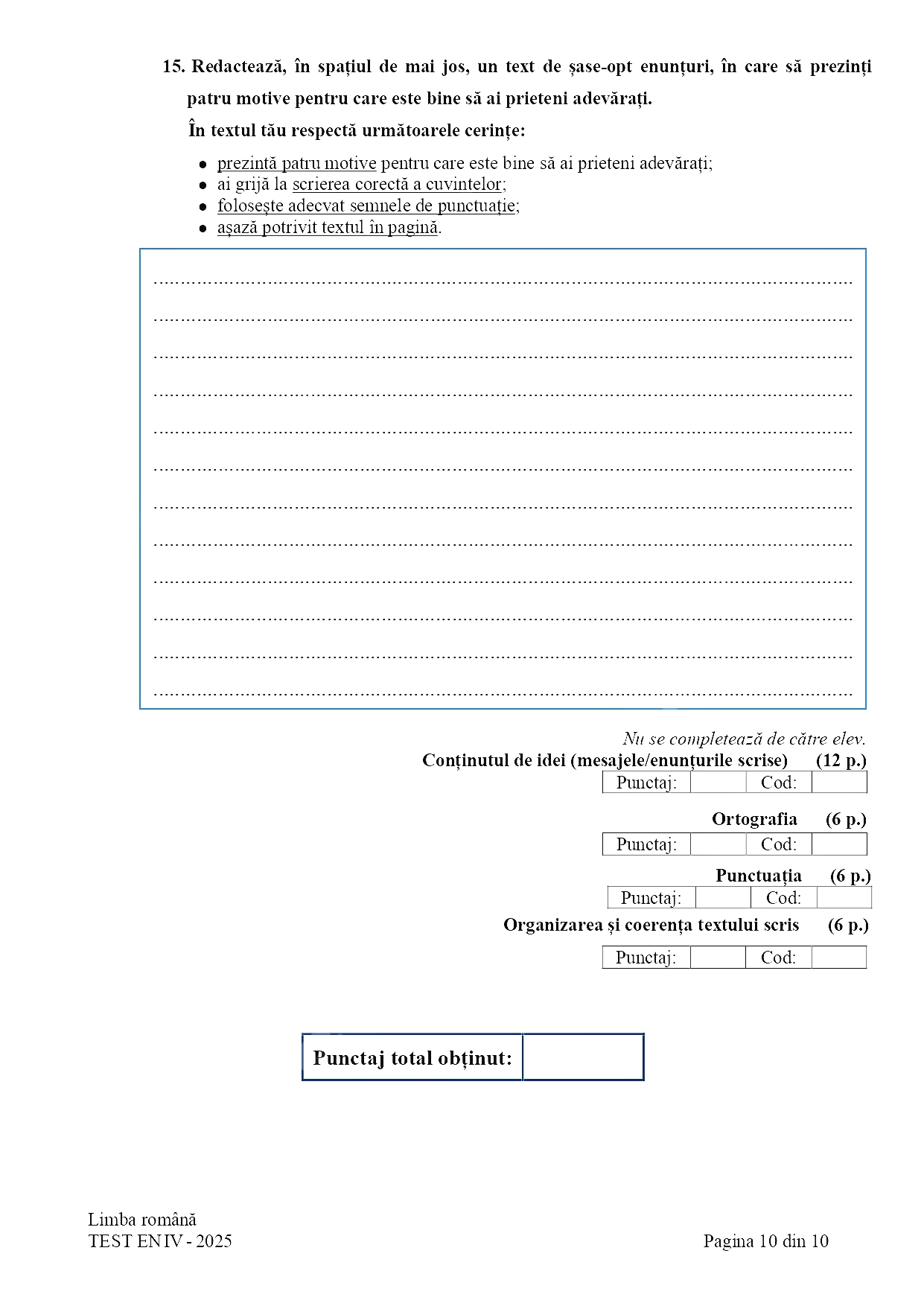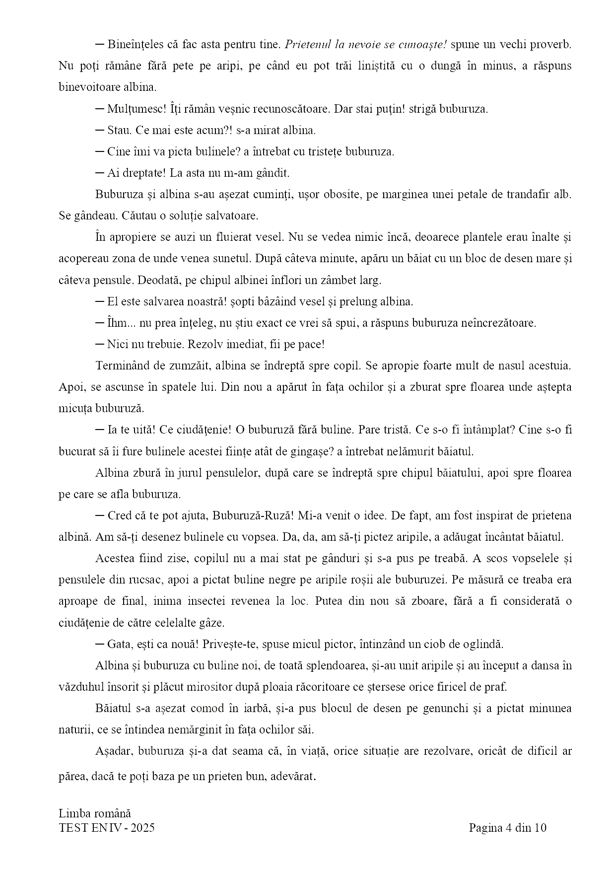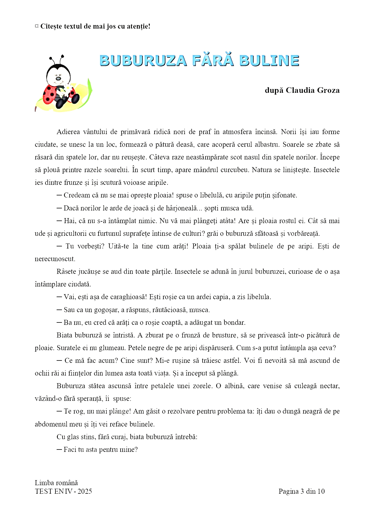 Elevii de clasa a IV-a au susținut marți, 20 mai, proba la Limba română din cadrul Evaluării Naționale 2025. Textul suport primit de elevi este „Buburuza fără buline” și aparține autoarei Claudia Groza. La ultima cerință, elevii au avut de redactat un text de șase-opt enunțuri, în care să prezinte patru motive pentru care este bine să ai prieteni adevărați.