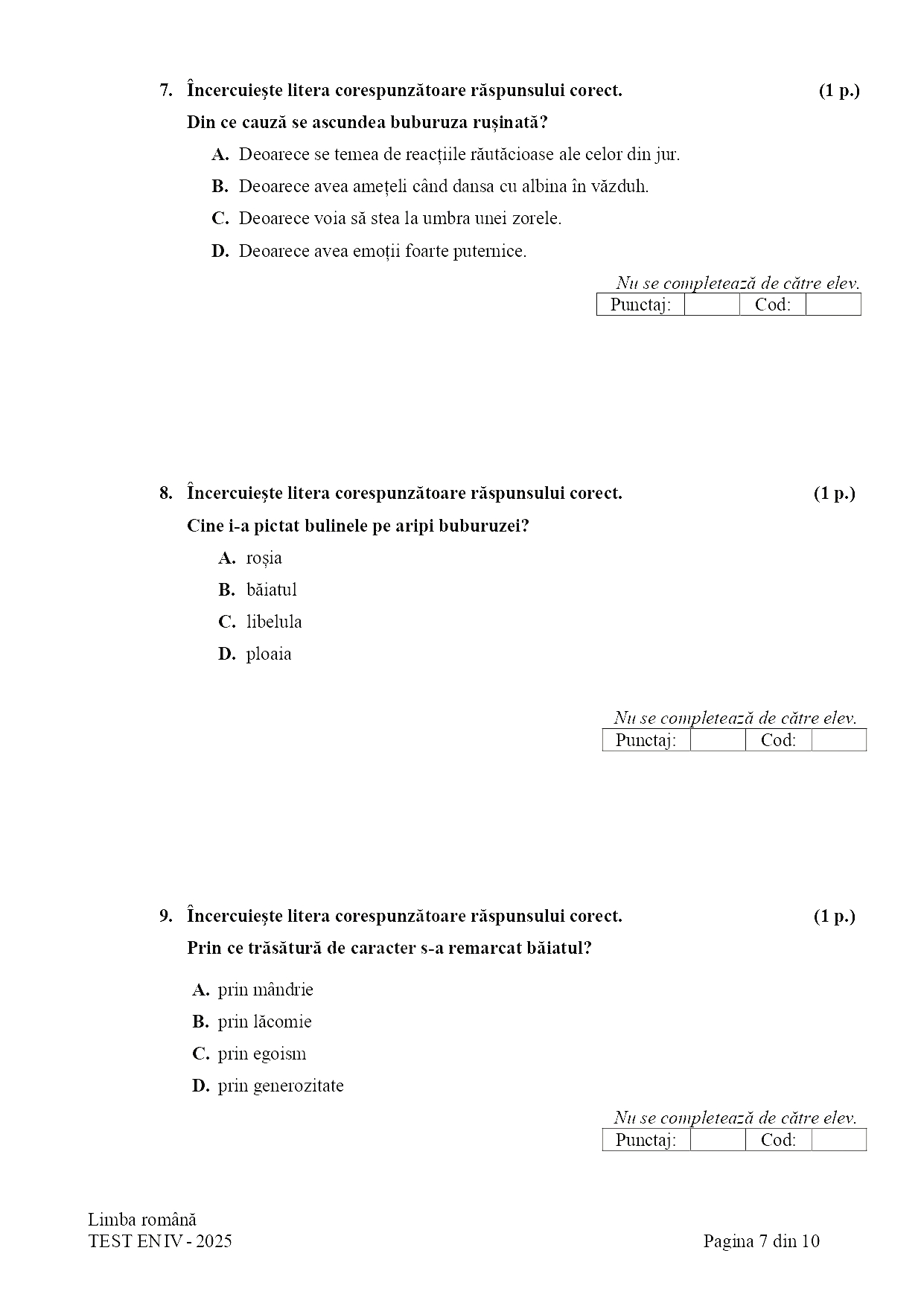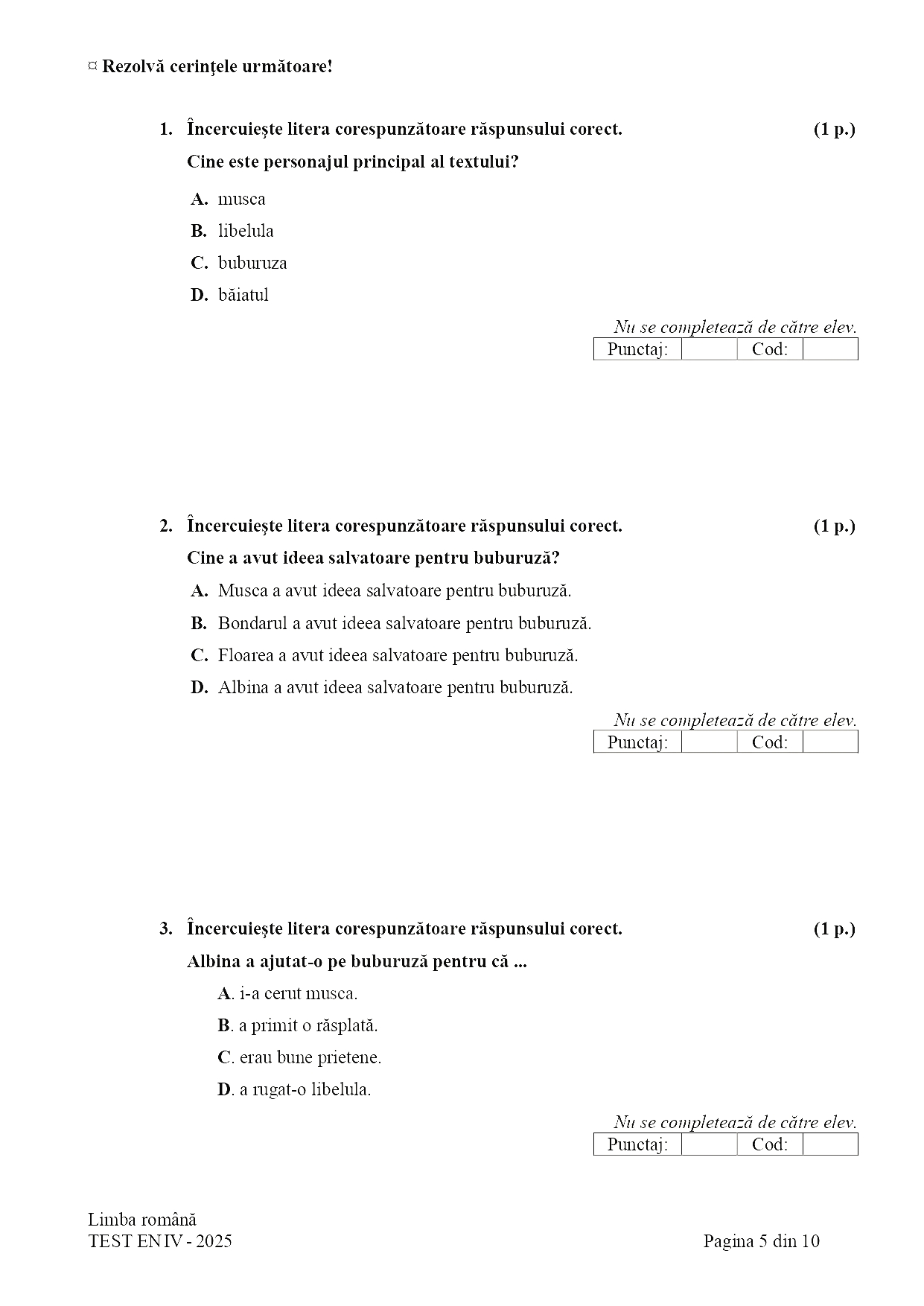 Pe baza textului suport, elevii au avut mai multe întrebări, la care puteau răspunde în 60 de minute, potrivit metodologiei.