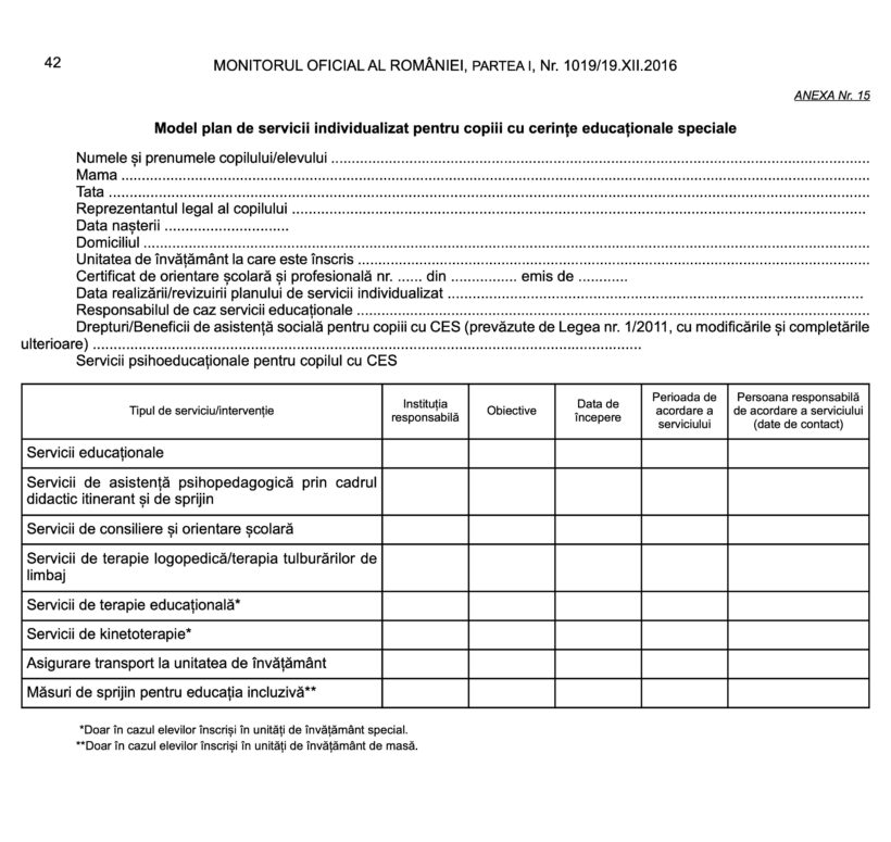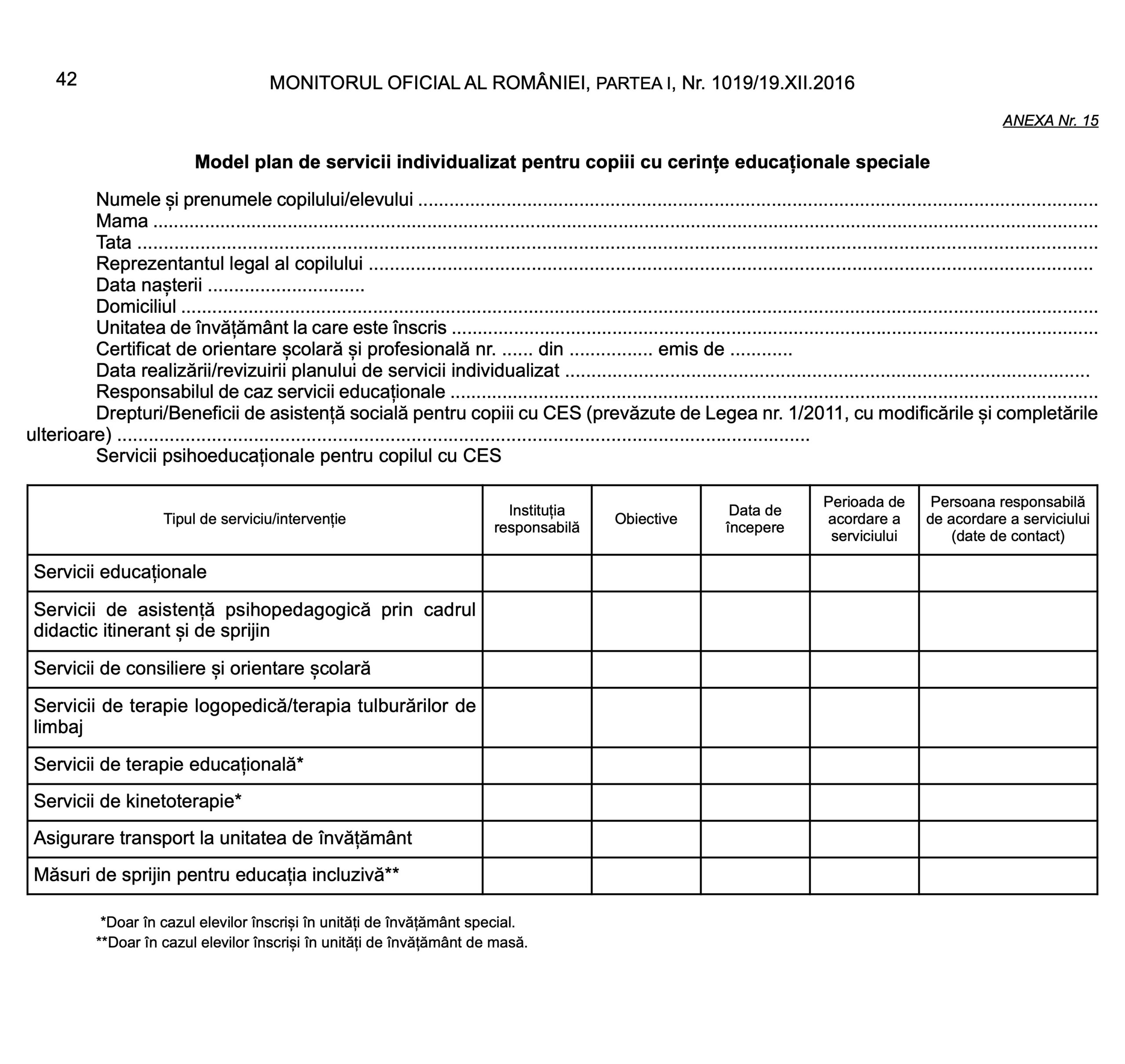 Formularul tip al planului de servicii individualizat – anexa nr. 15.