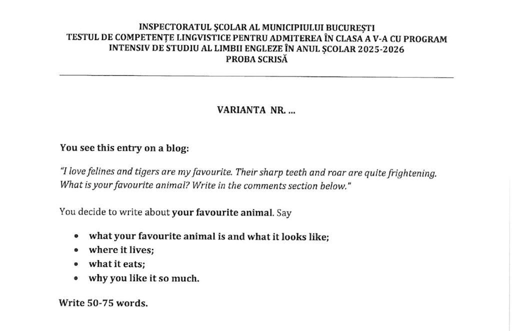 *Testul se susține în aceeași zi și la aceeași oră, cu subiecte unice, în toate unităţile de învăţământ gimnazial de stat și particular din Municipiul Bucuresti care au prevăzute clase a V-a cu program intensiv de predare a limbii engleze în planul de școlarizare pentru anul școlar 2025-2026.