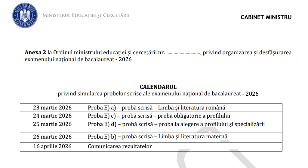 Ministerul Educației și Cercetării a publicat marți, 12 august, în consultare publică, proiectul de calendar pentru sesiunea 2026 a examenului național de Bacalaureat. Documentul arată că, la fel ca până în anul 2024, probele de evaluare a competențelor lingvistice și digitale vor fi susținute în vară, înaintea probelor scrise.