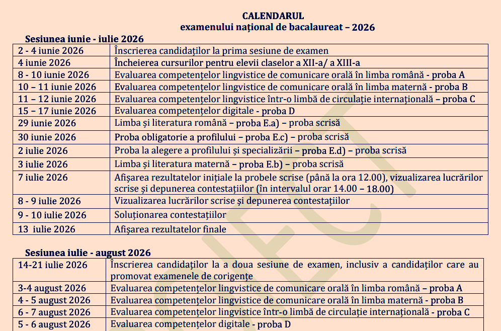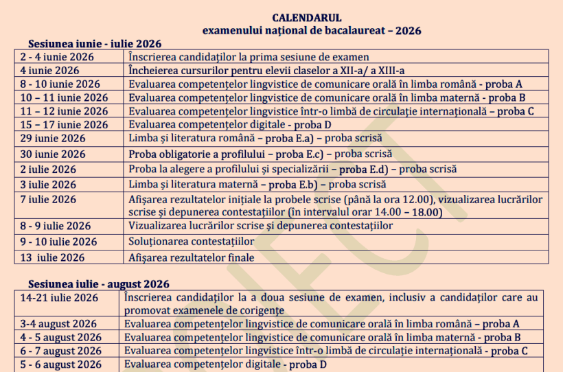 Ministerul Educației și Cercetării a publicat marți, 12 august, în consultare publică, proiectul de calendar pentru sesiunea 2026 a examenului național de Bacalaureat. Documentul arată că, la fel ca până în anul 2024, probele de evaluare a competențelor lingvistice și digitale vor fi susținute în vară, înaintea probelor scrise.