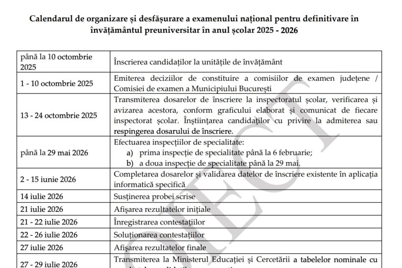 Calendarul examenului de definitivat 2026 a fost pus în consultare publică, luni, de Ministerul Educației și Cercetării. Înscrierea profesorilor se face până pe 10 octombrie și proba scrisă va avea loc pe 14 iulie 2026, potrivit documentului.