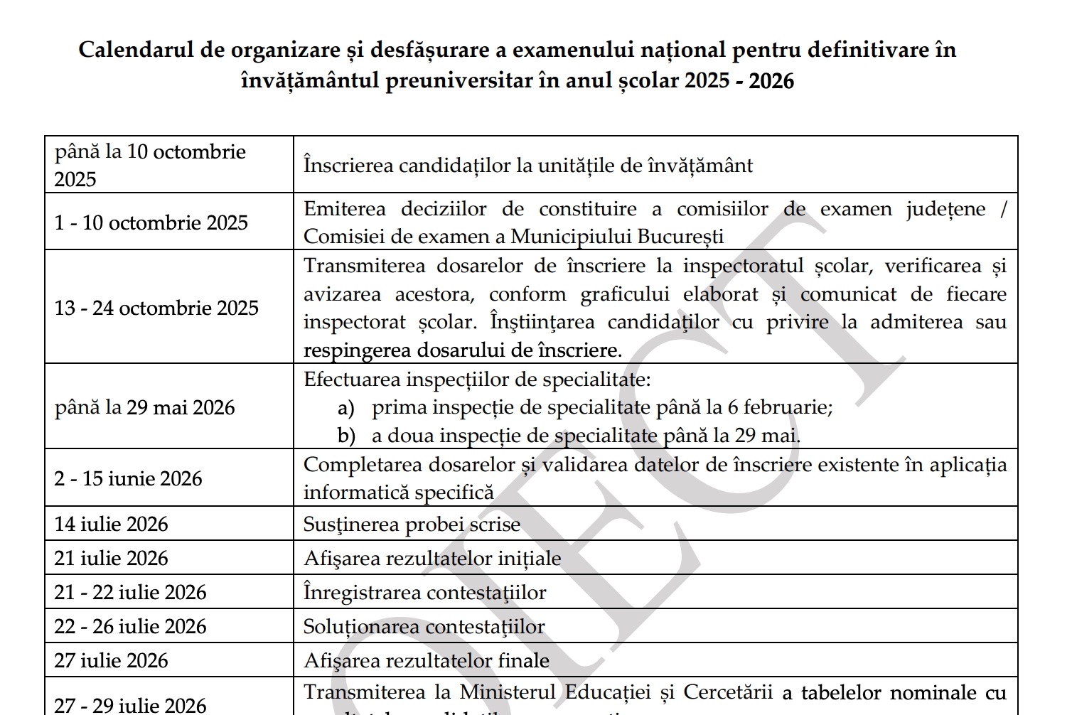 Calendarul pentru Definitivat 2026 – proiect