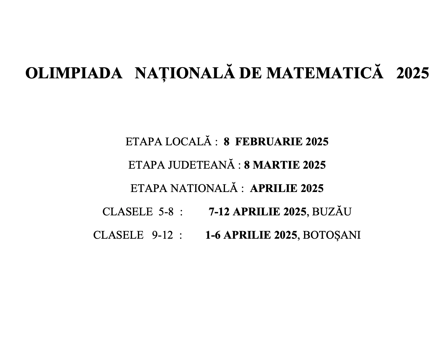 Calendarul Olimpiadei Naționale de Matematică (ONM) pentru 2025 include faza locală pe 8 sau 15 februarie, faza județeană pe 8 martie, iar etapa națională este programată în două locații: între 1-6 aprilie la Botoșani și între 7-12 aprilie la Buzău, potrivit surselor Edupedu.ro.
