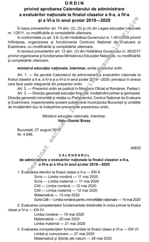 Descarcă de aici, în format .pdf, Ordinul de ministru care aprobă Calendarul Evaluărilor Naționale la finalul claselor a II-a, a IV-a și a VI-a 2020