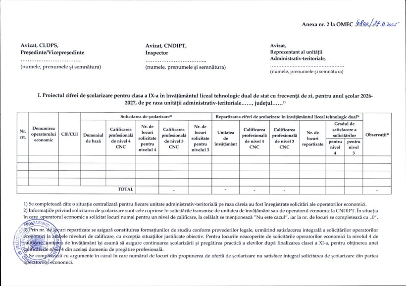 • Operatorii economici transmit la Centrul Național de Dezvoltare a Învățământului Profesional și Tehnic (CNDIPT) solicitările de școlarizare pentru clasa a IX-a în învățământul liceal tehnologic dual cu frecvență de zi, pentru anul școlar 2026-2027, conform modelului de solicitare din anexa nr. 7 la ordinul de aprobare a prezentului calendar.
